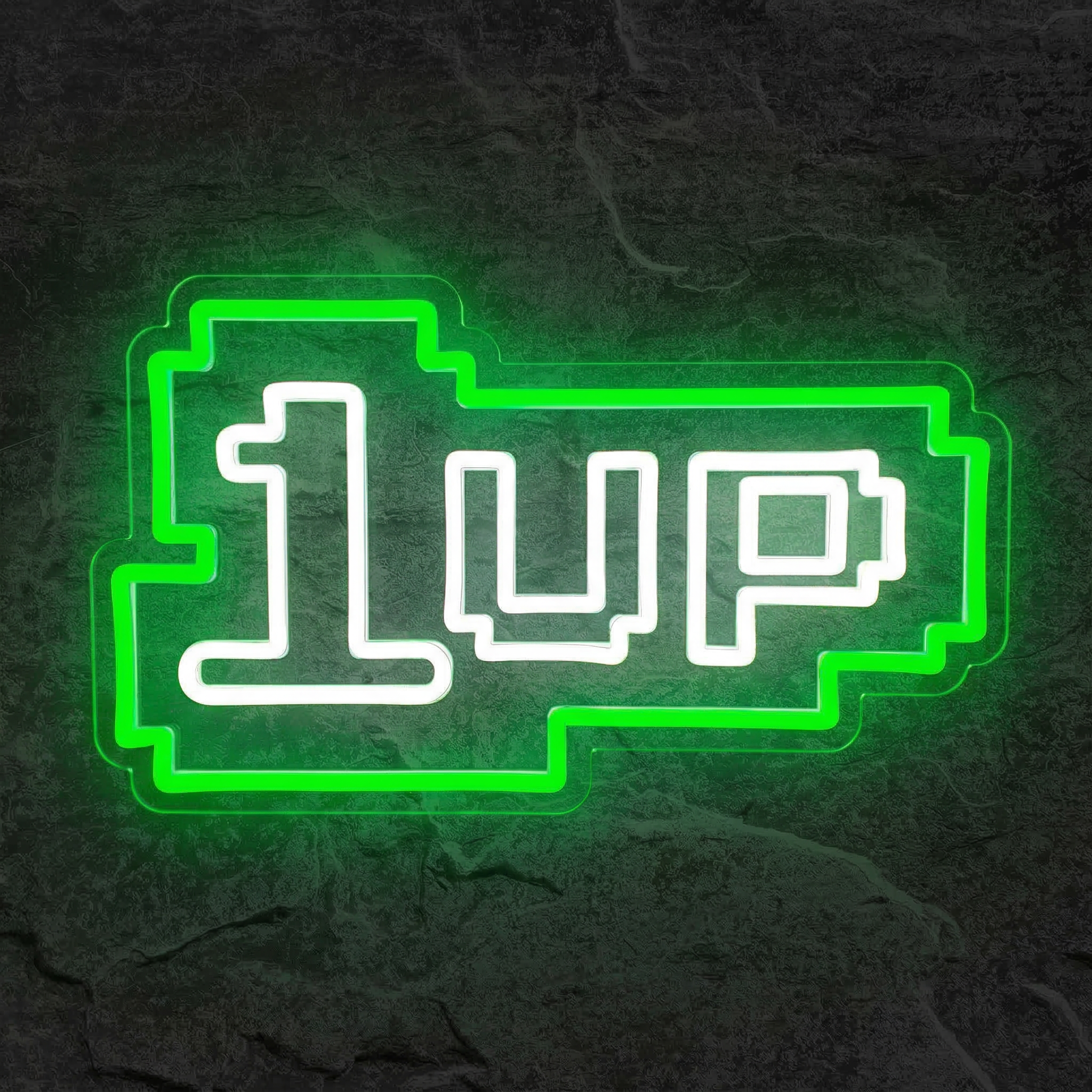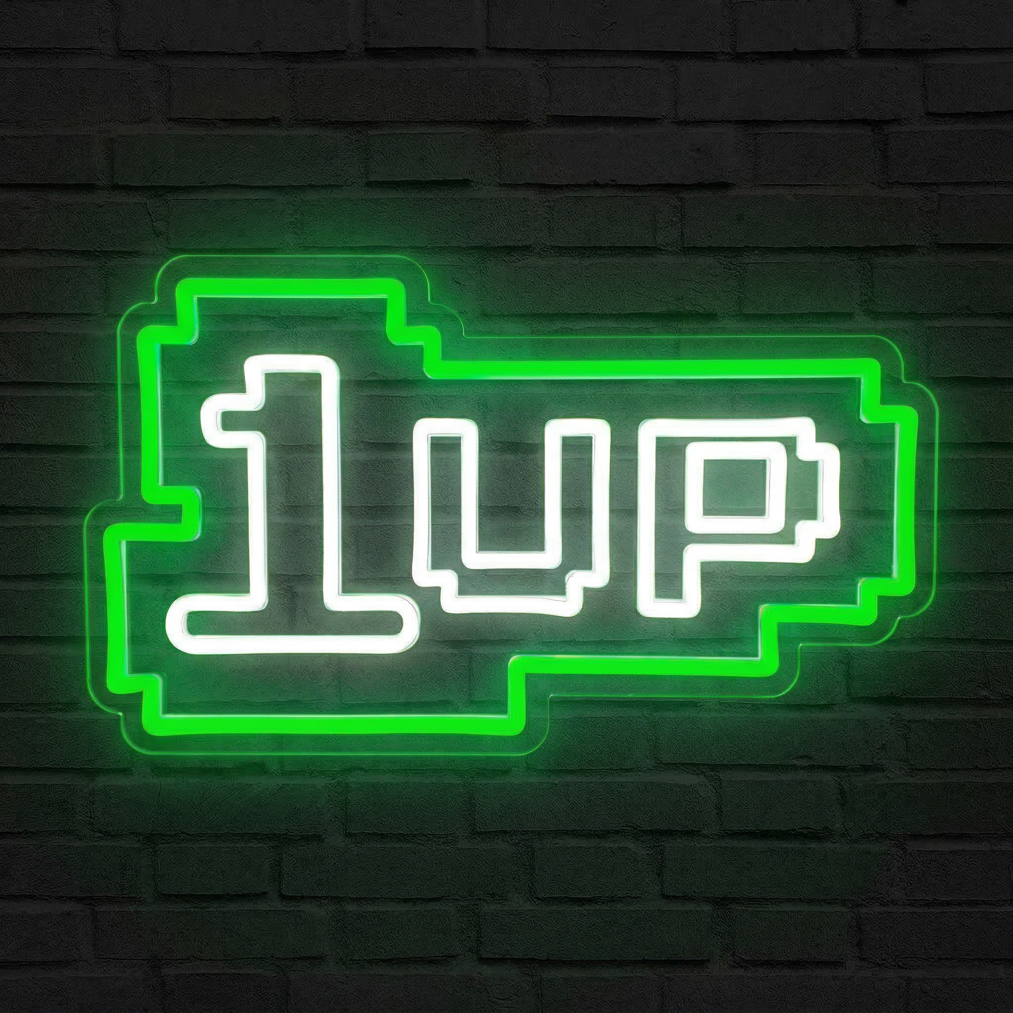 Plongez dans l'univers rétro du gaming avec le Néon 1 Up NeonStar : lettres pixellisées blanches sur fond vert lumineux, directement inspiré des classiques de l'arcade.