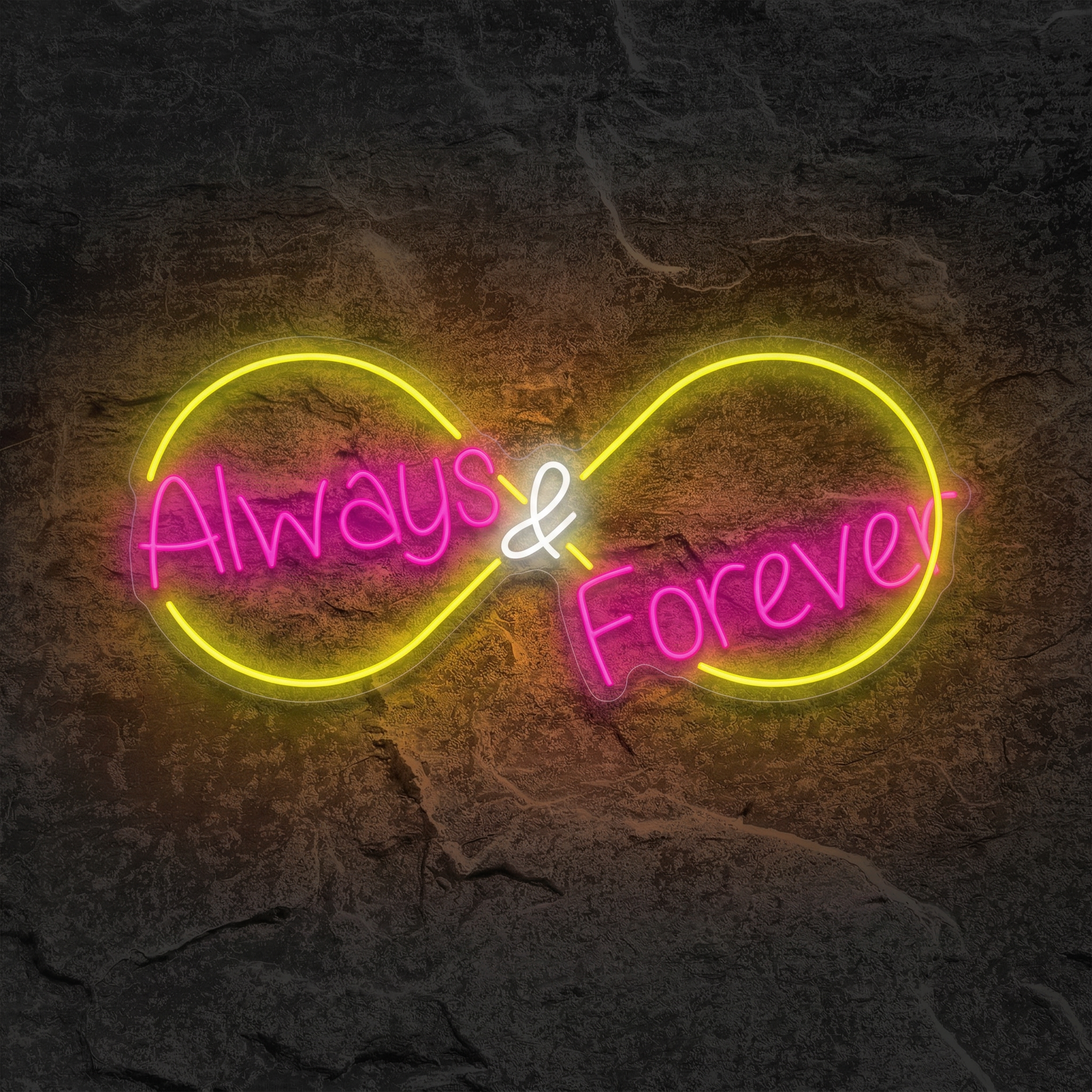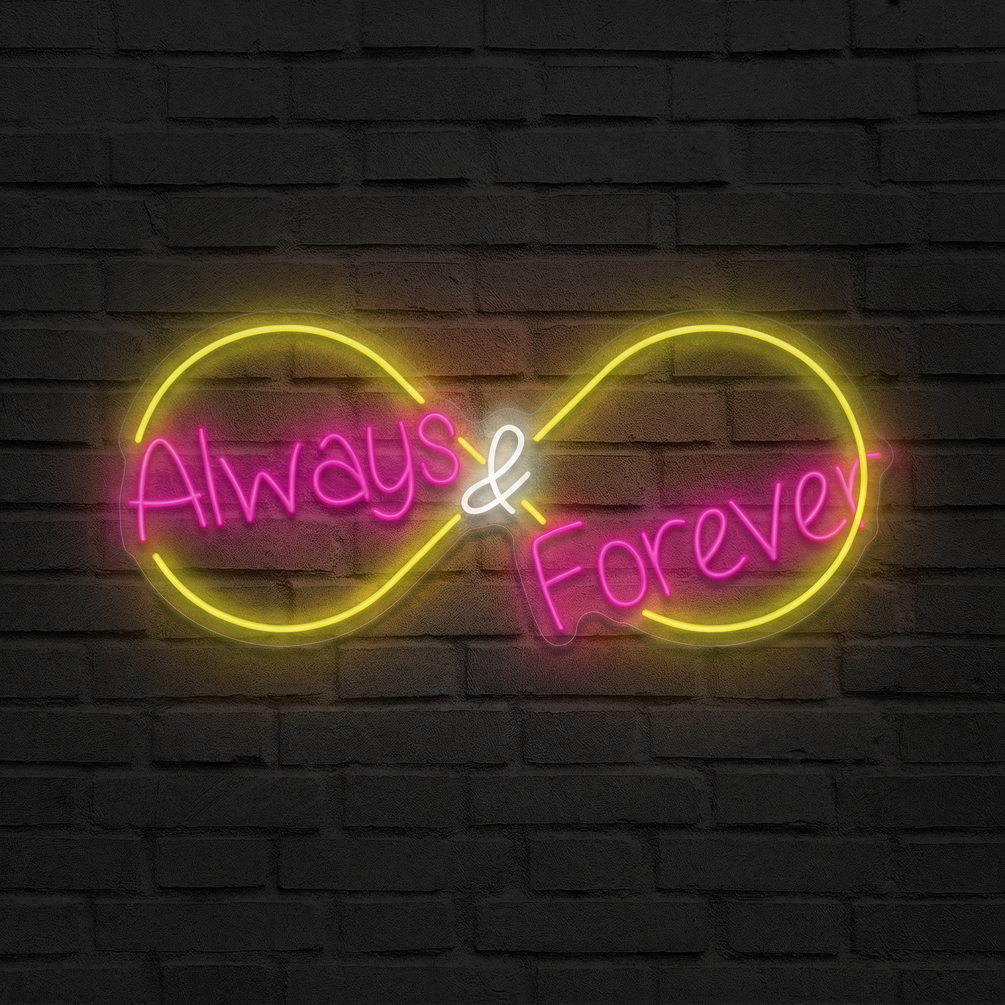 Certaines phrases n'ont pas besoin d'être criées pour résonner. « Always and Forever » — toujours et pour toujours — est de celles-là. Gravée dans la lumière, cette enseigne néon transforme un simple mur en déclaration permanente. Que vous l'installiez dans une chambre, un salon, une boutique ou au cœur d'une salle de réception, elle capte immédiatement le regard et installe une atmosphère chaude, intime et profondément romantique.