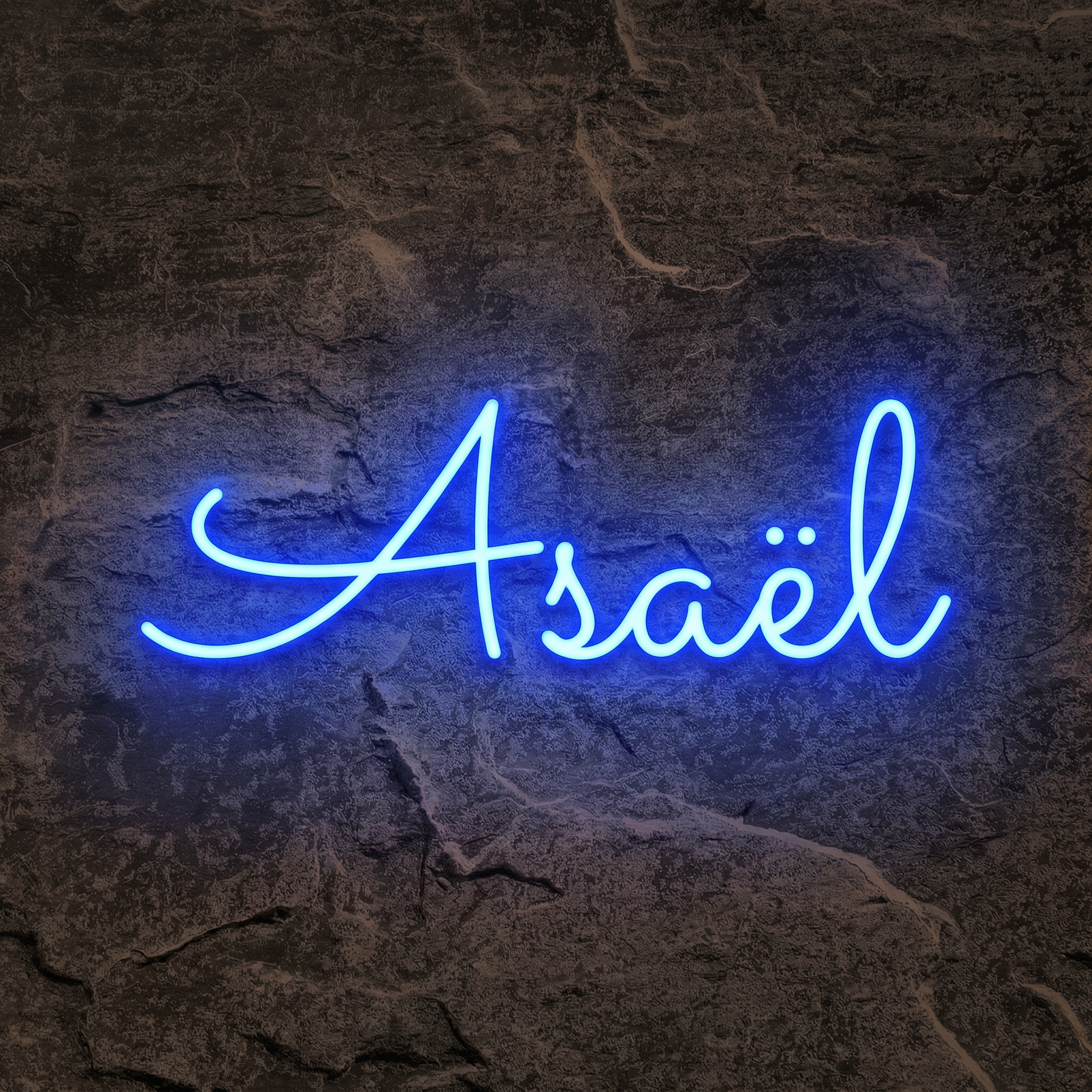 Offrez une touche lumineuse et personnelle avec le Néon Asaël de NeonStar — un prénom illuminé en bleu, façonné dans une typographie élégante pour sublimer n'importe quel intérieur.
