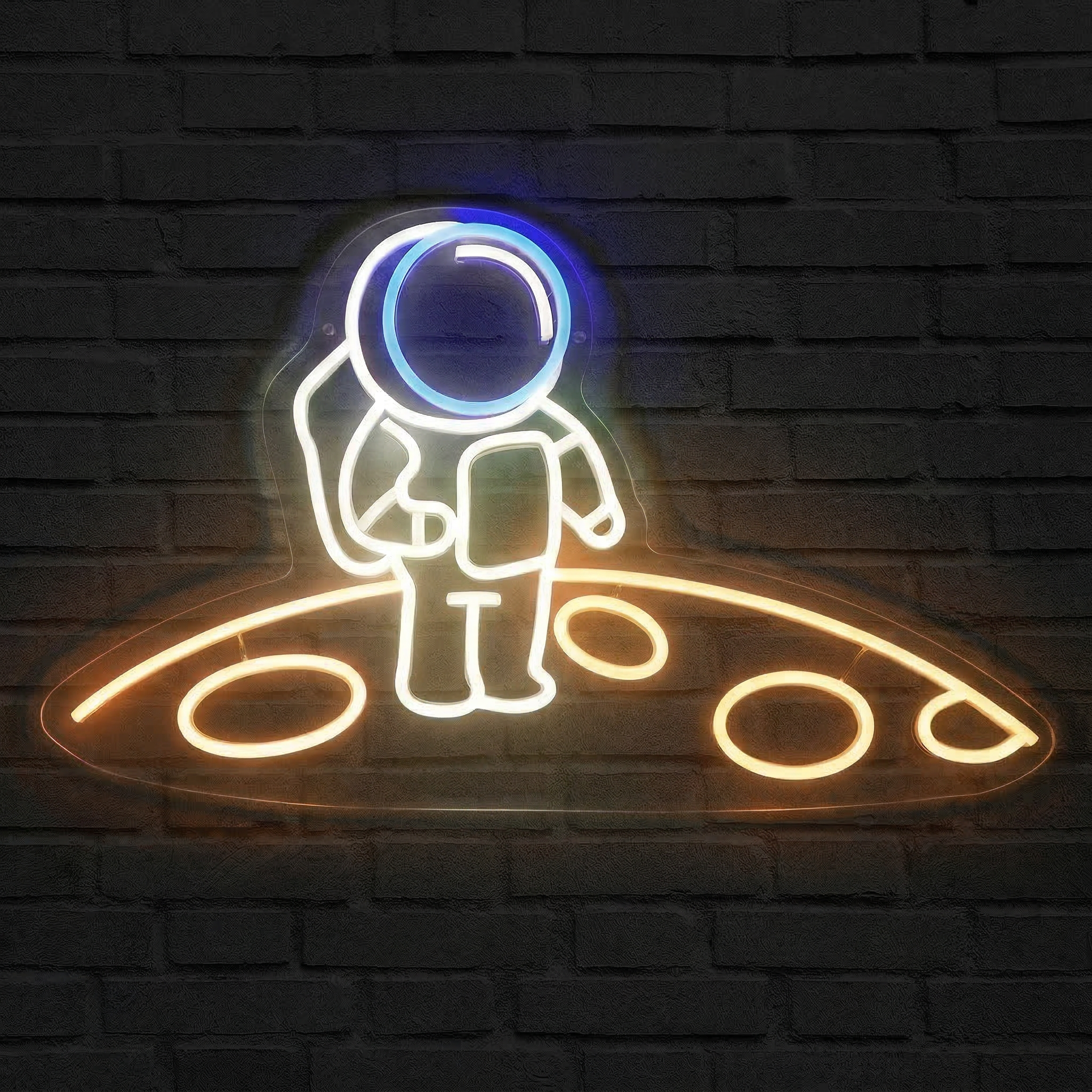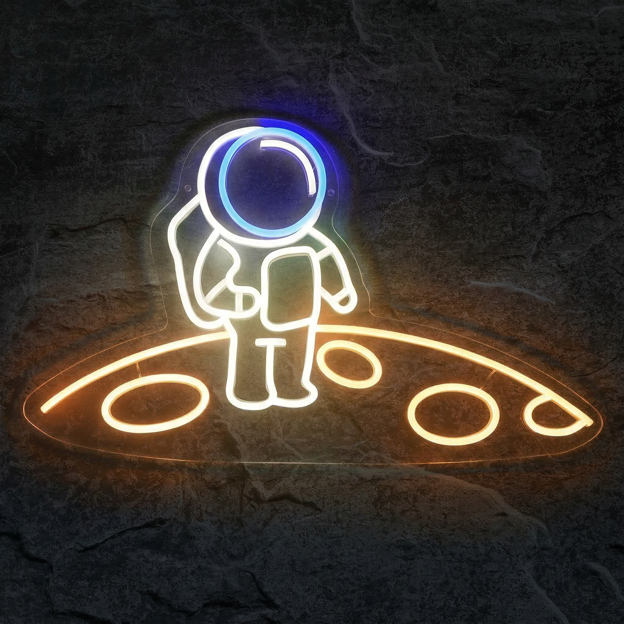 Chez NeonStar, nous ne fabriquons pas de simples enseignes lumineuses — nous concevons des objets pensés pour durer et pour émouvoir. Le Néon Astronaute Lune est réalisé avec des tubes LED flexibles de haute qualité, montés sur un fond acrylique transparent découpé au laser. Résultat : la silhouette de l'astronaute semble littéralement flotter sur votre mur, comme en apesanteur. L'effet visuel est saisissant, de jour comme de nuit.