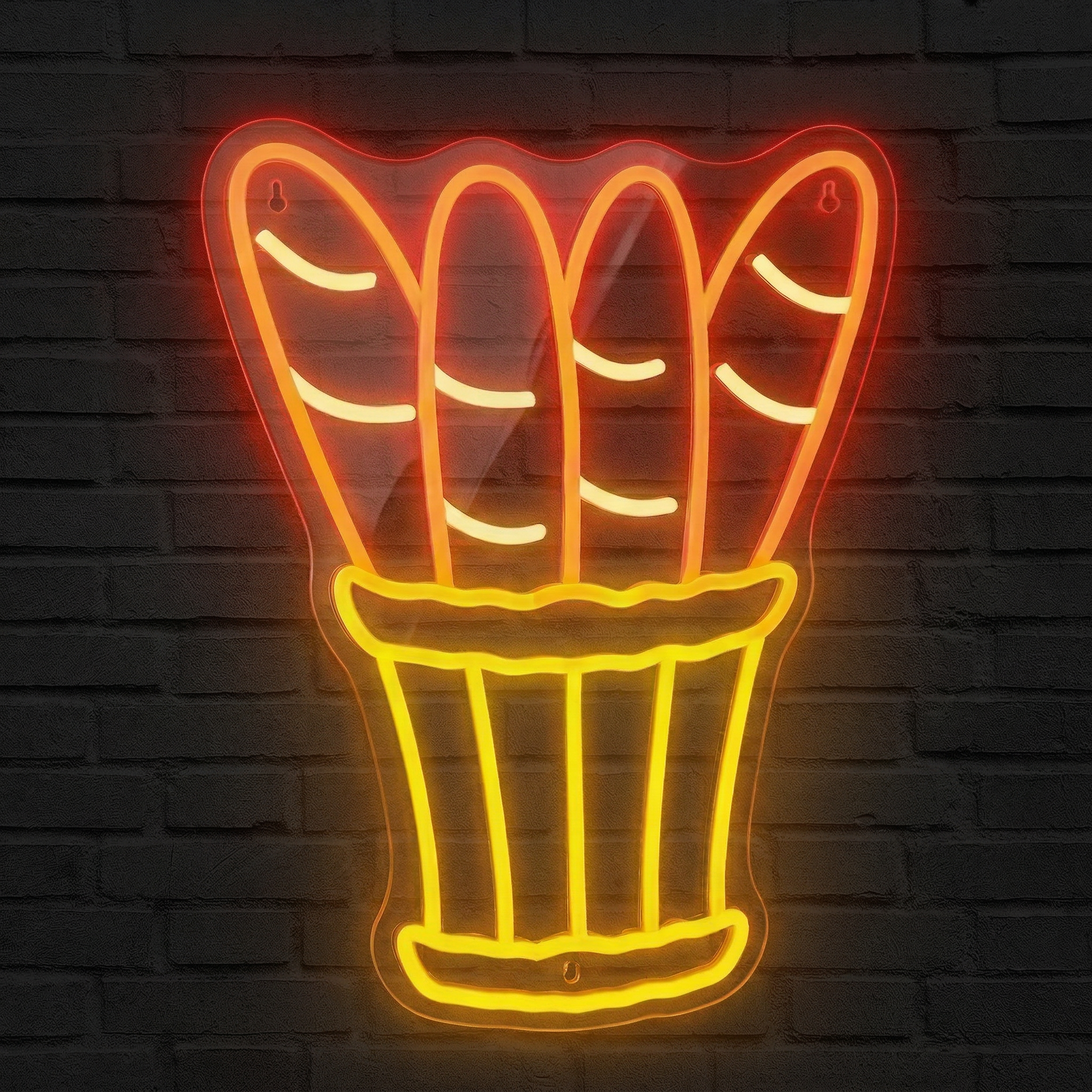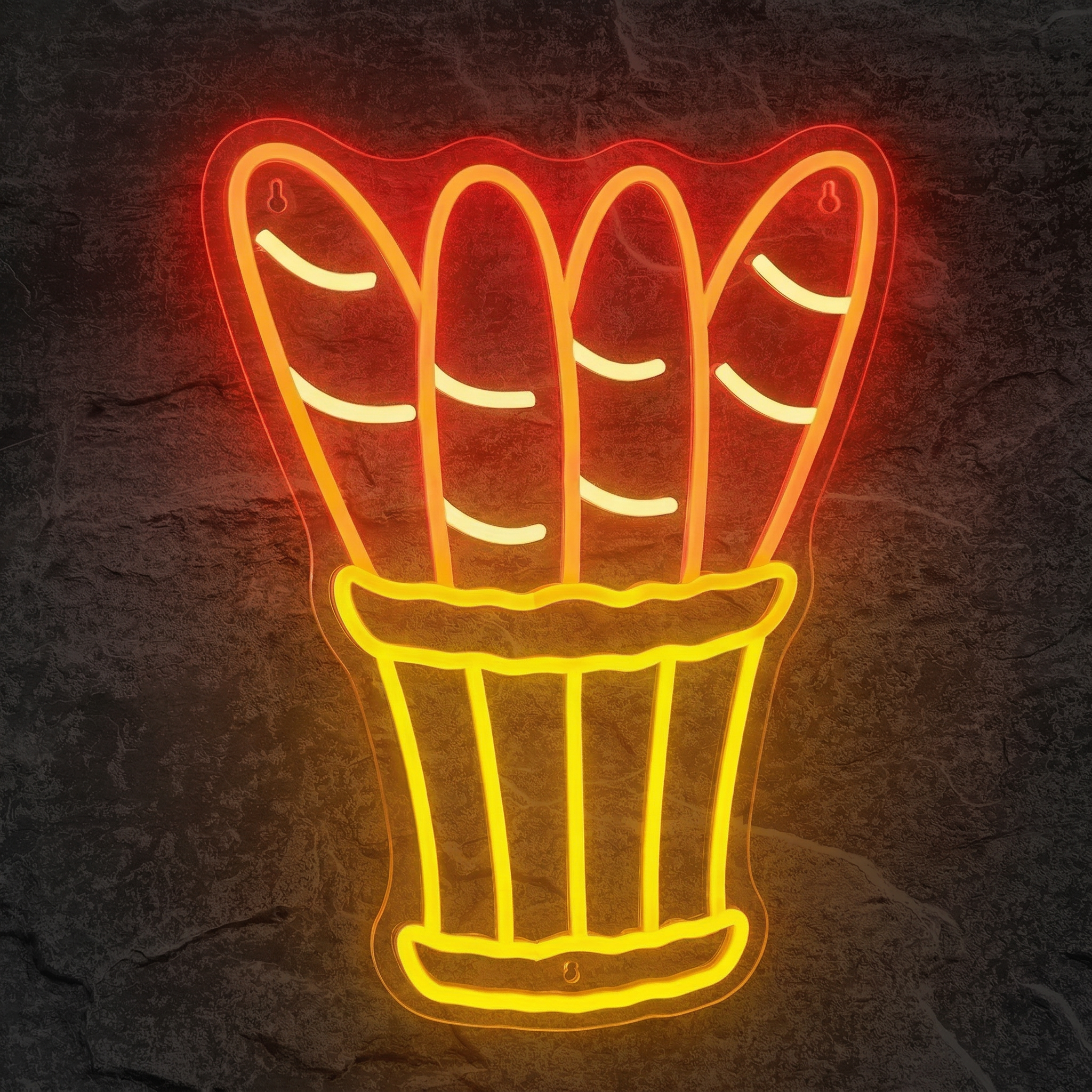 Il existe des symboles qui parlent à tout le monde, instantanément et sans détour. La baguette de pain en fait partie. Icône de la culture française reconnue dans le monde entier, elle évoque la chaleur d'une boulangerie de quartier, le parfum du pain frais et la simplicité des plaisirs authentiques. Notre Néon Baguettes de Pain capture toute cette poésie du quotidien dans une composition lumineuse aussi appétissante que décorative : quatre baguettes dorées nichées dans un panier tressé aux tons jaune doré, baignées d'une lumière rouge-orange qui réchauffe instantanément l'atmosphère.