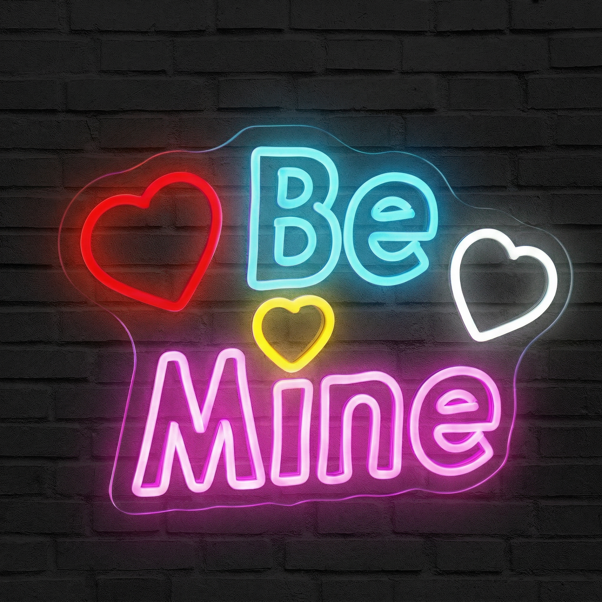 Il y a des mots qui ne s'oublient pas. « Be Mine » fait partie de ceux-là. Court, direct, terriblement romantique — ce message lumineux transforme instantanément n'importe quel espace en déclaration d'amour suspendue dans le temps. Chez NeonStar, nous avons imaginé ce néon pour ceux qui veulent dire les choses avec éclat, littéralement. Son alliance de bleu doux et de rose fuchsia, encadrée de trois cœurs colorés, crée un contraste visuel saisissant qui capte le regard dès l'entrée dans la pièce.