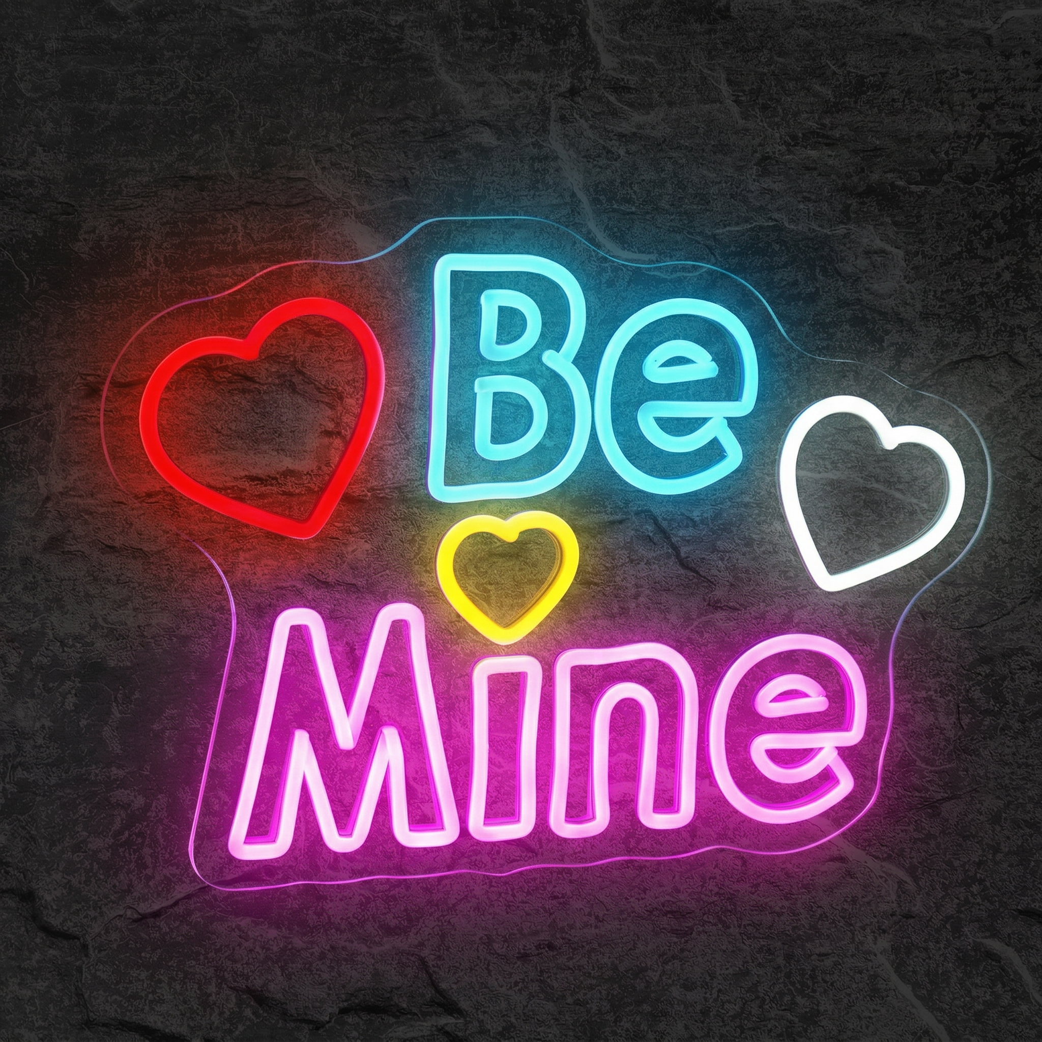 Le Néon Be Mine associe un bleu lumineux pour le texte et un rose fuchsia vif pour les cœurs décoratifs. Ce contraste chaud-froid est l'une des signatures visuelles de ce néon, qui lui confère son caractère à la fois romantique et moderne.