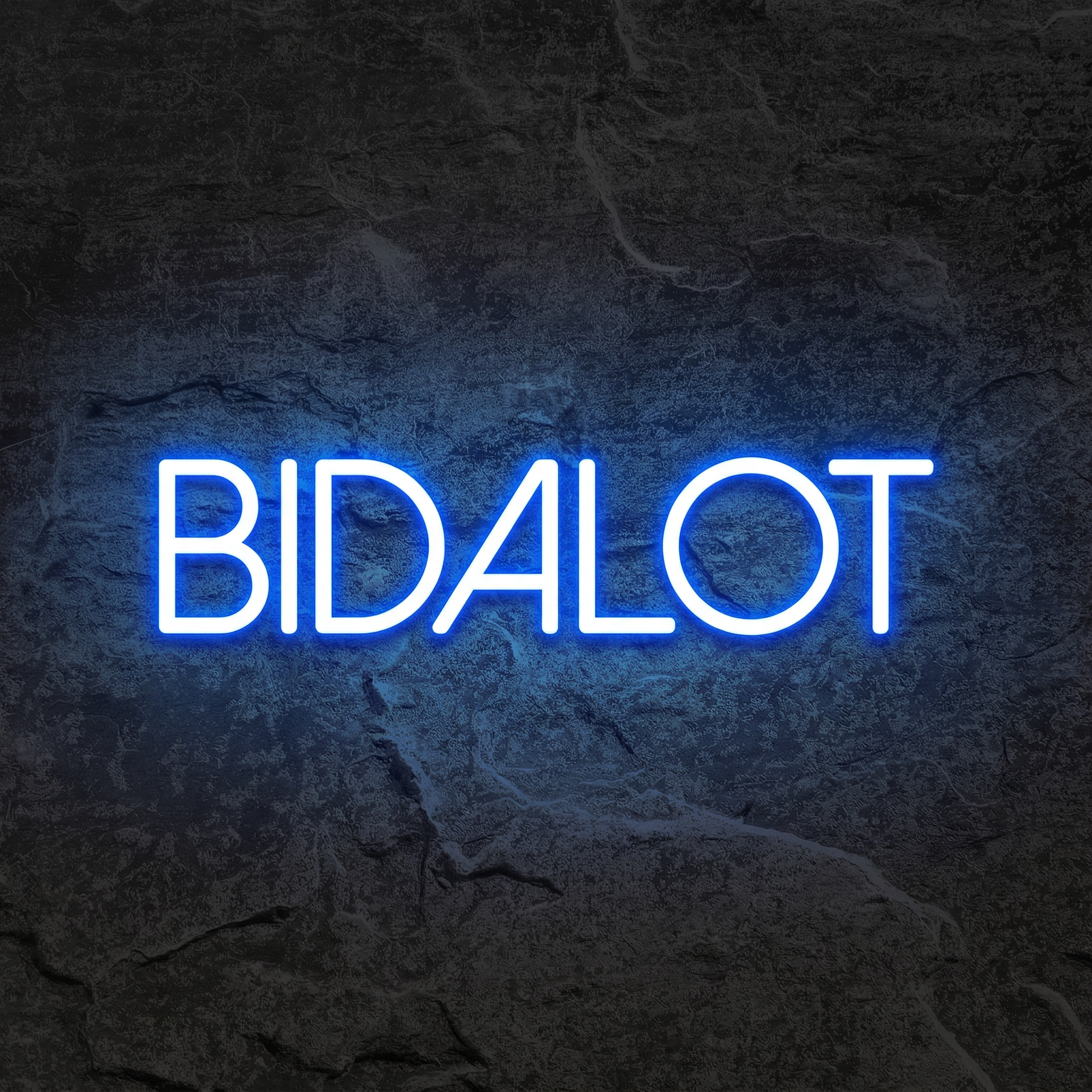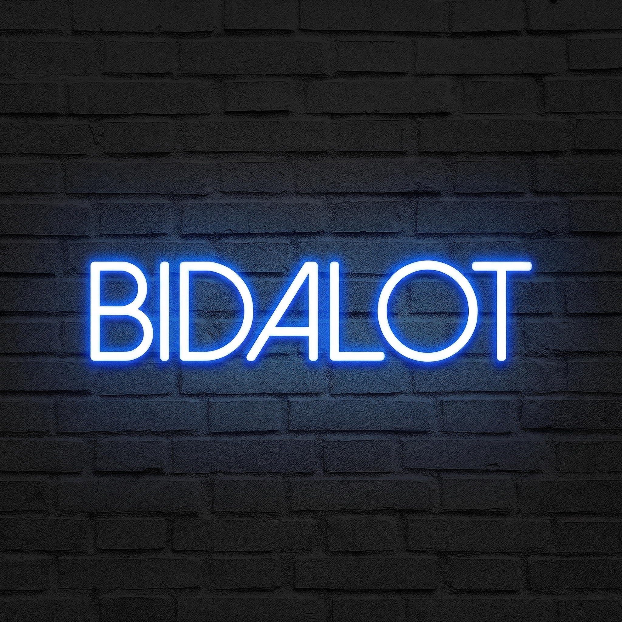 Le texte Bidalot est composé en police Mona, une typographie aux tracés fluides et modernes qui donne au prénom une personnalité visuelle affirmée. Le bleu choisi ici n'est pas un bleu quelconque — c'est un bleu profond et lumineux, vibrant dans la pénombre, capable de transformer une pièce entière en studio photo, en repaire de créatif ou en décor de soirée inoubliable. L'alignement à droite apporte une composition dynamique, parfaite pour s'intégrer dans un intérieur soigné.