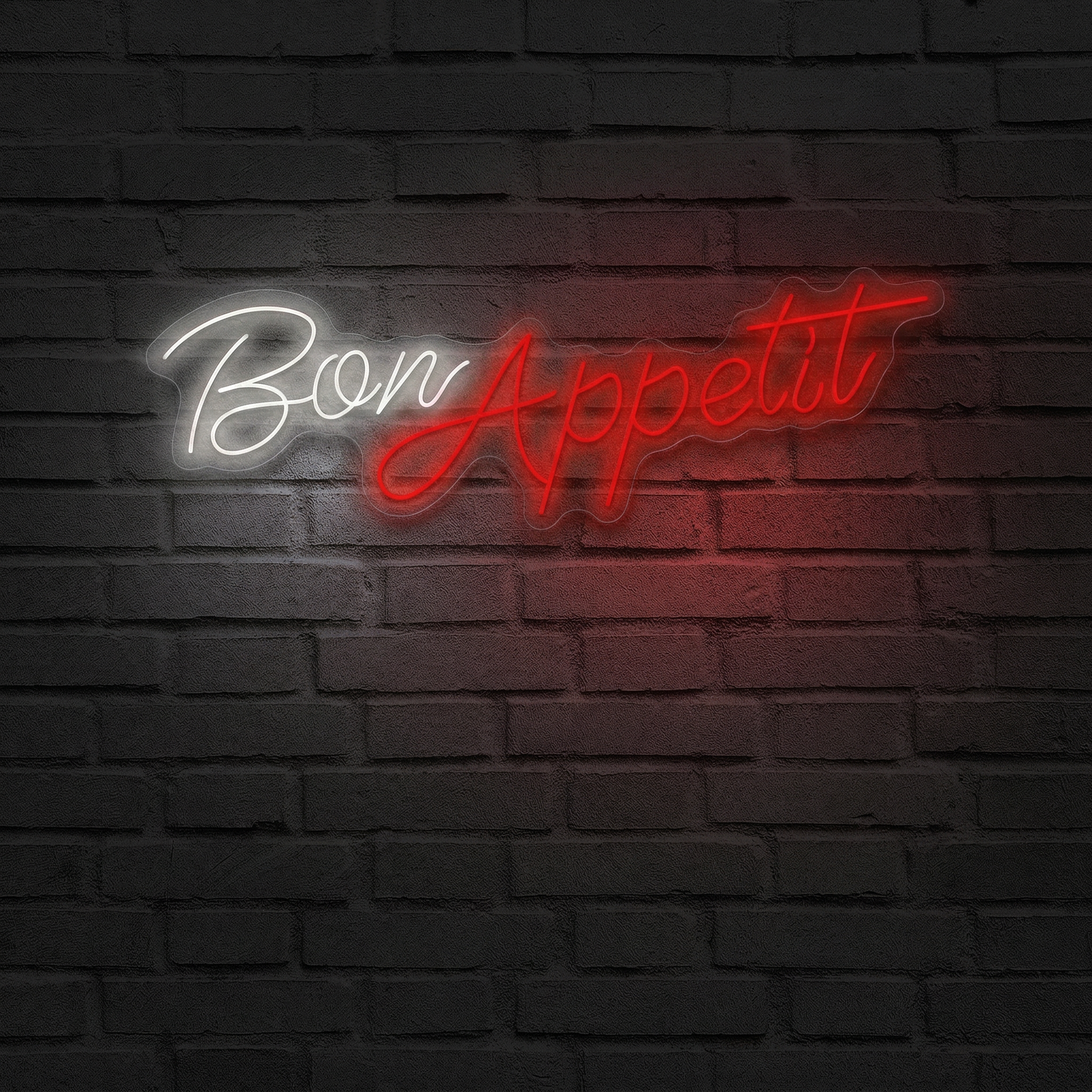 Le Néon Bon Appétit est disponible en plusieurs tailles pour s'adapter à tous les espaces : au-dessus d'un plan de travail, dans une niche, derrière un bar, sur le mur d'un couloir menant à la salle à manger, ou même en vitrine d'un restaurant ou d'un food truck. Chaque configuration devient une invitation. Chaque photo Instagram prise devant lui devient virale. Car oui, ce néon est aussi redoutablement photogénique — et ça, vos clients ou vos convives ne l'oublieront pas.