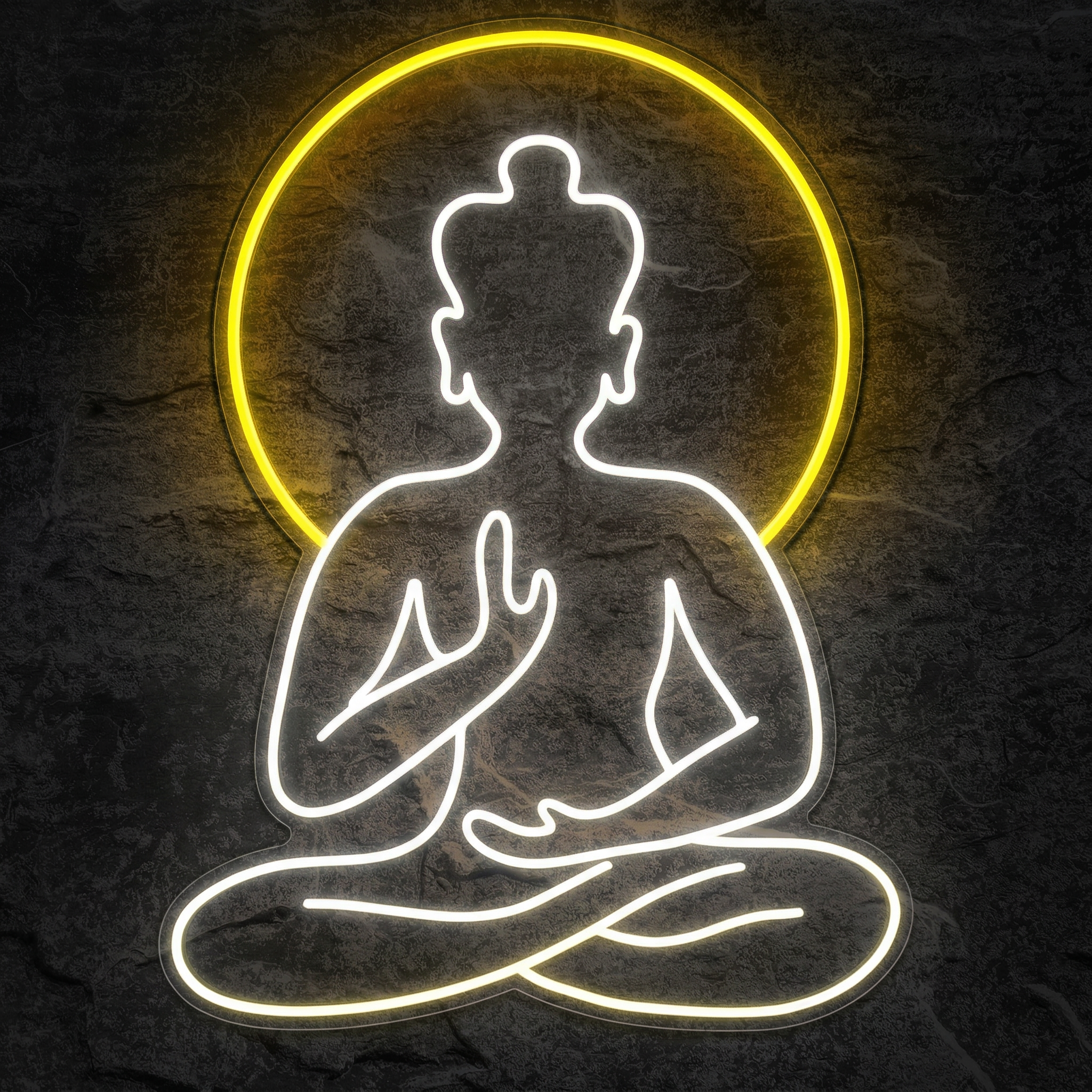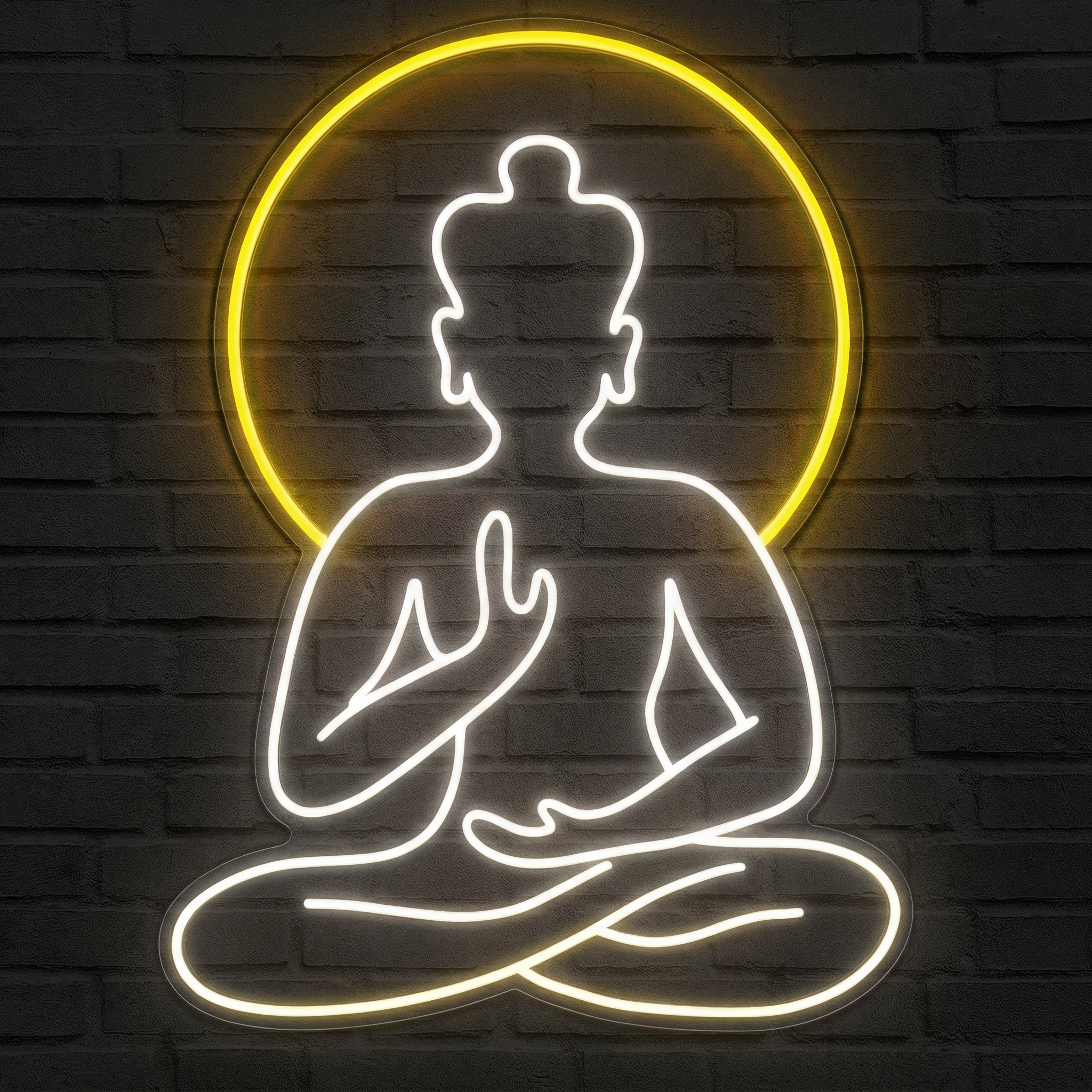 La beauté de ce néon repose sur l'équilibre parfait entre épure et symbolisme. Les lignes blanches lumineuses dessinent avec précision la posture de méditation, tandis que le cercle doré — représentation du halo sacré ou de la pleine conscience — ajoute une dimension spirituelle et esthétique. Chaque courbe a été travaillée pour restituer fidèlement la puissance symbolique du Bouddha, tout en s'intégrant harmonieusement dans un intérieur contemporain. Le résultat est à la fois graphique et profond.