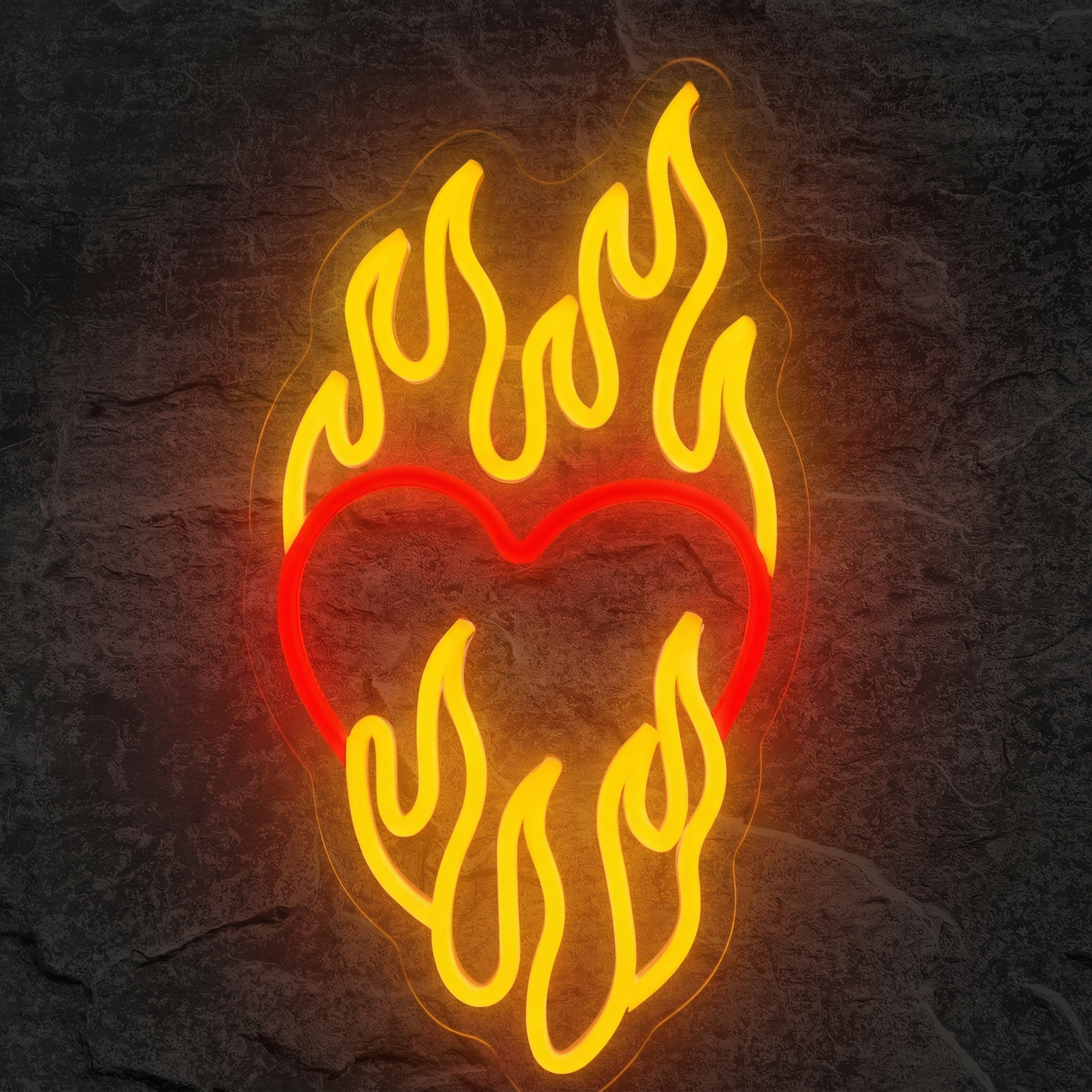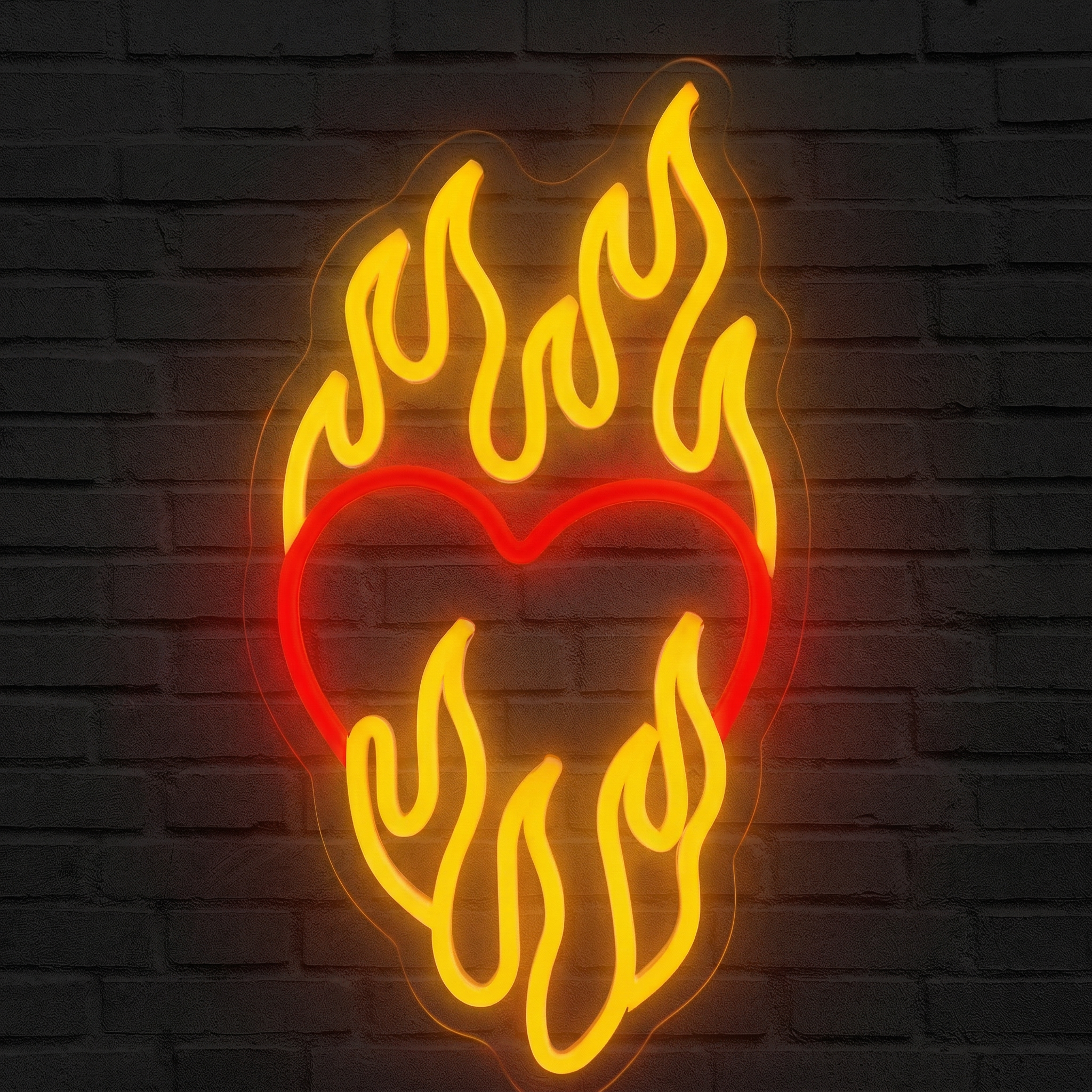 Le Cœur Flammes n'est pas un simple néon en forme de cœur. C'est une composition dynamique où les flammes semblent danser autour du cœur, comme si l'amour lui-même était en train de consumer tout sur son passage. Le rouge vif du cœur contraste avec les teintes orangées et dorées des flammes, créant un dégradé lumineux d'une beauté saisissante. Disponible en plusieurs coloris pour s'adapter à votre ambiance, ce néon transforme instantanément un mur blanc en tableau vivant.