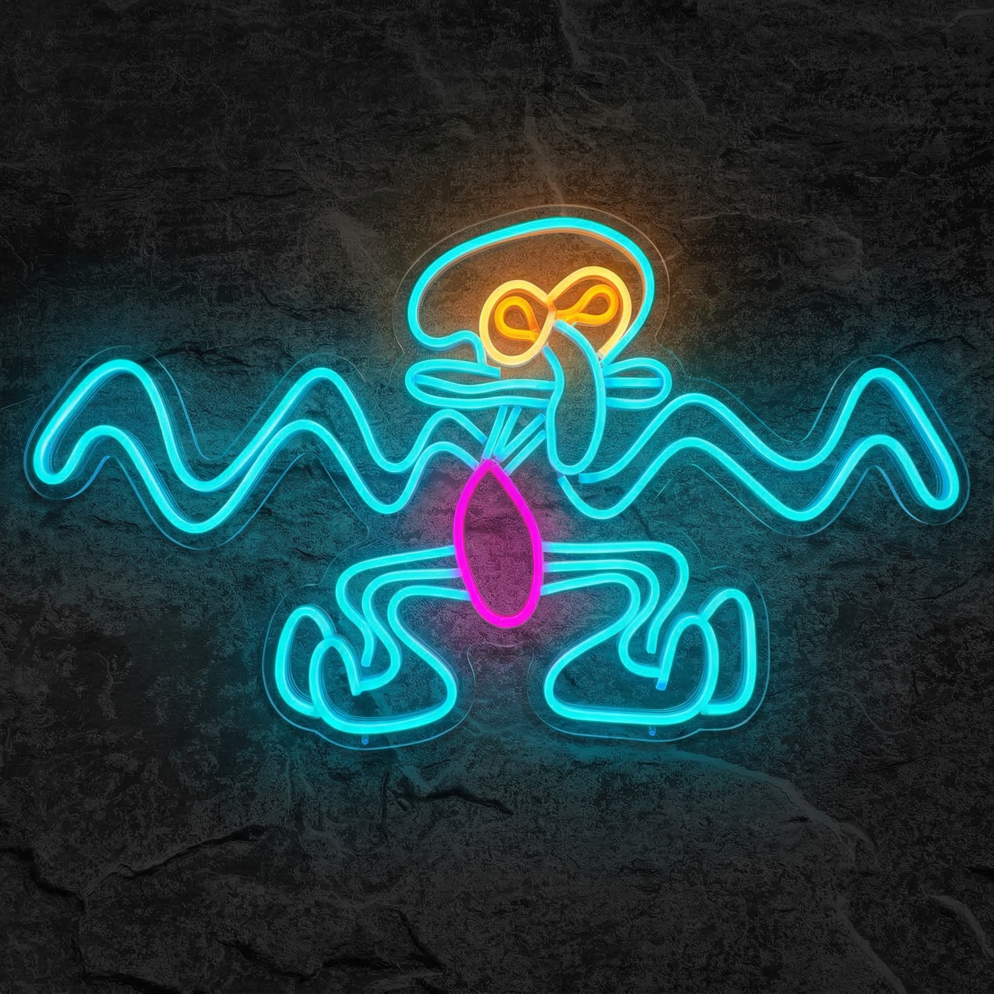 Ce néon capture avec une précision remarquable l'expression désabusée et reconnaissable entre mille de Carlo. Ses yeux globuleux, son air perpétuellement contrarié et ses tentacules caractéristiques sont reproduits fidèlement grâce à un tracé LED souple de haute précision. Résultat : une silhouette immédiatement identifiable, qui provoque sourires et éclats de rire chez tous les visiteurs, fans de la série ou non.