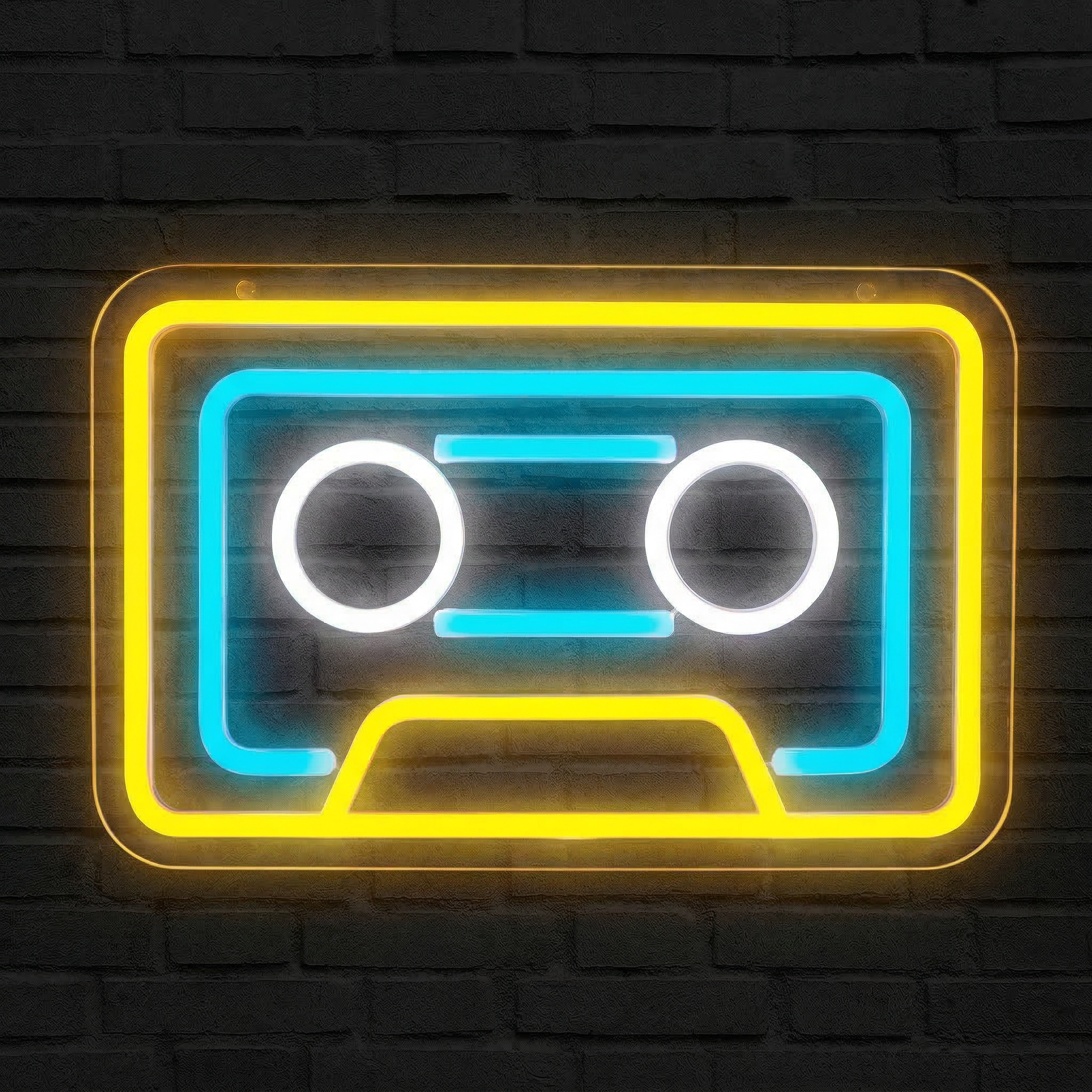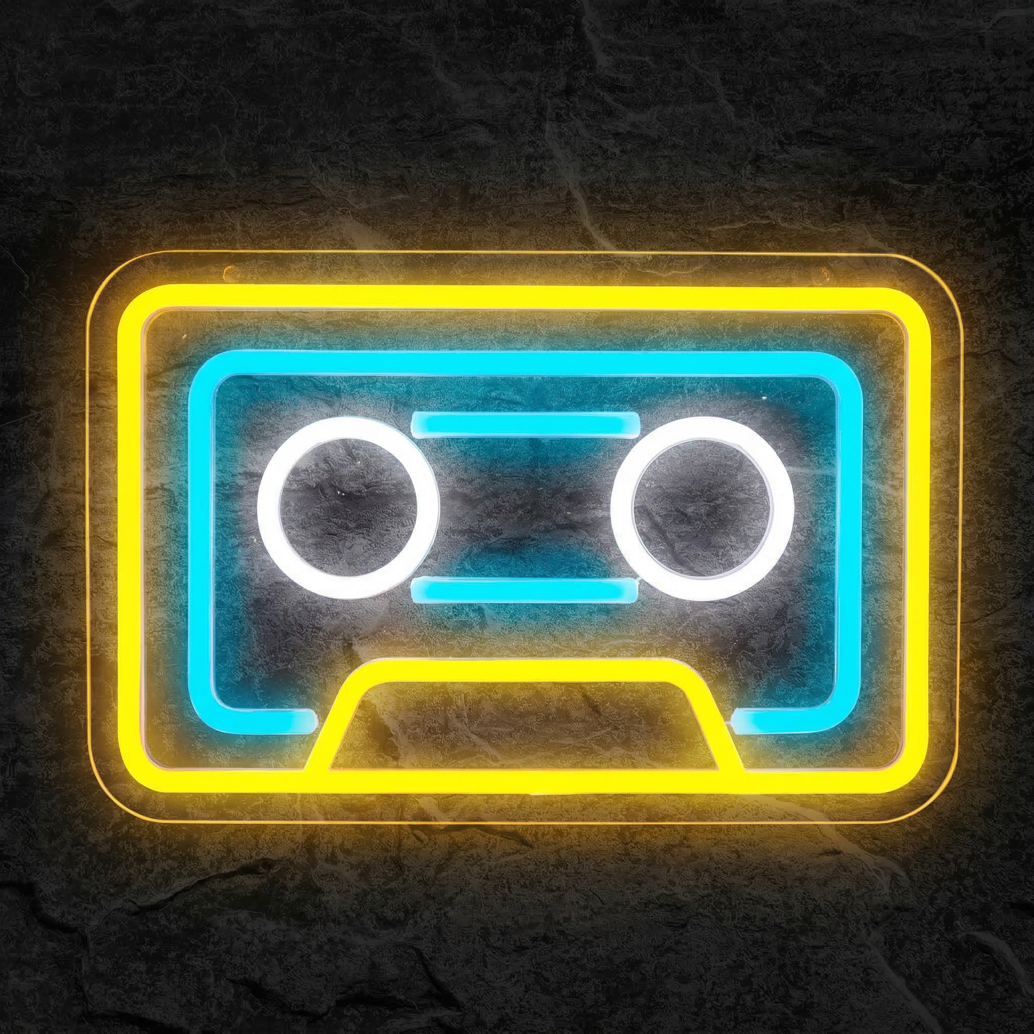 Avec son cadre jaune vif, son liseré turquoise et ses bobines blanches lumineux, ce néon reproduit fidèlement la silhouette emblématique de la cassette des années 80. Le résultat est saisissant : une pièce graphique, colorée et immédiatement reconnaissable, qui devient le point focal de n'importe quelle pièce. Accroché dans un studio d'enregistrement, une chambre, un salon ou un bar à cocktails, il transforme instantanément l'ambiance en décor rétro-chic assumé.