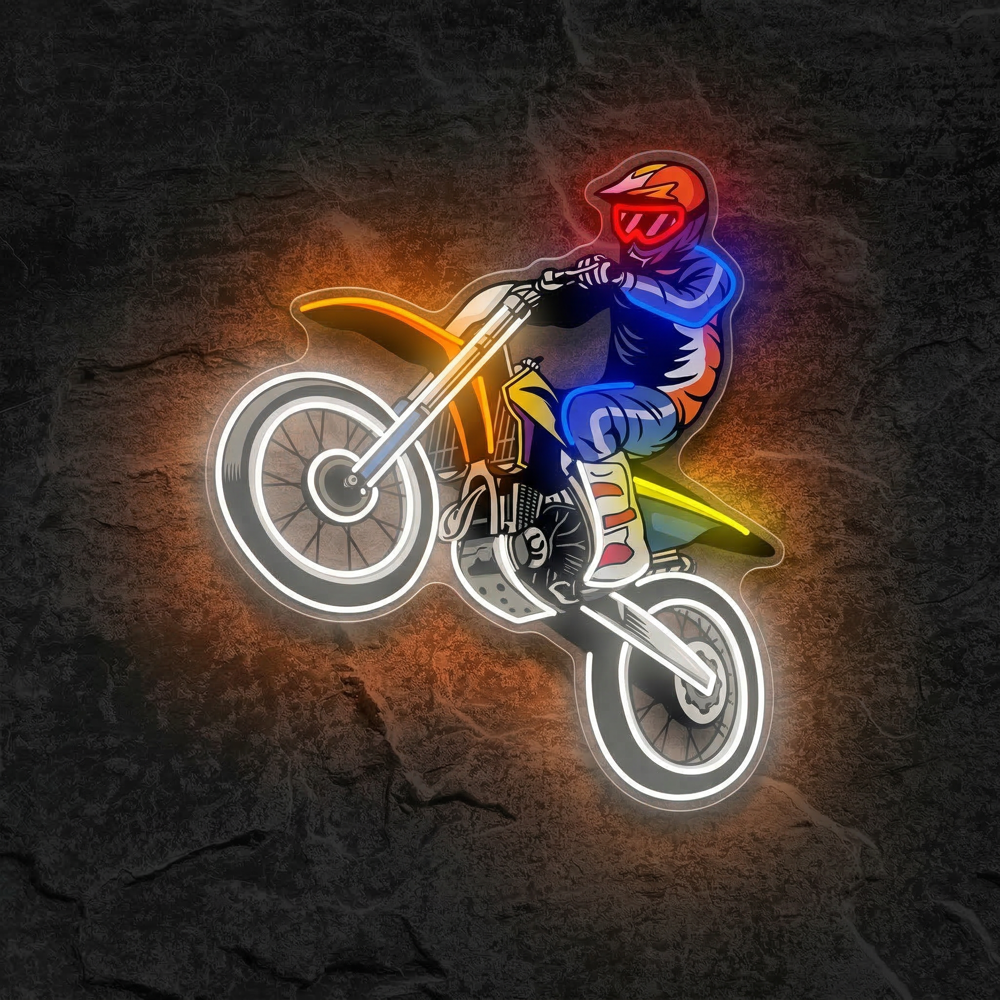 Conçu et fabriqué avec soin par NeonStar, ce néon associe des tubes LED flexibles de haute qualité à un support en acrylique premium découpé au laser. La silhouette du cavalier en plein saut est reproduite avec une précision remarquable, chaque détail — la posture du pilote, la courbe de la moto, l'élan du mouvement — se distingue clairement grâce à un éclairage intense et homogène. Contrairement aux néons à gaz traditionnels, il ne chauffe pas, ne grésille pas et ne vibre pas : il brille, tout simplement, en silence et en beauté.