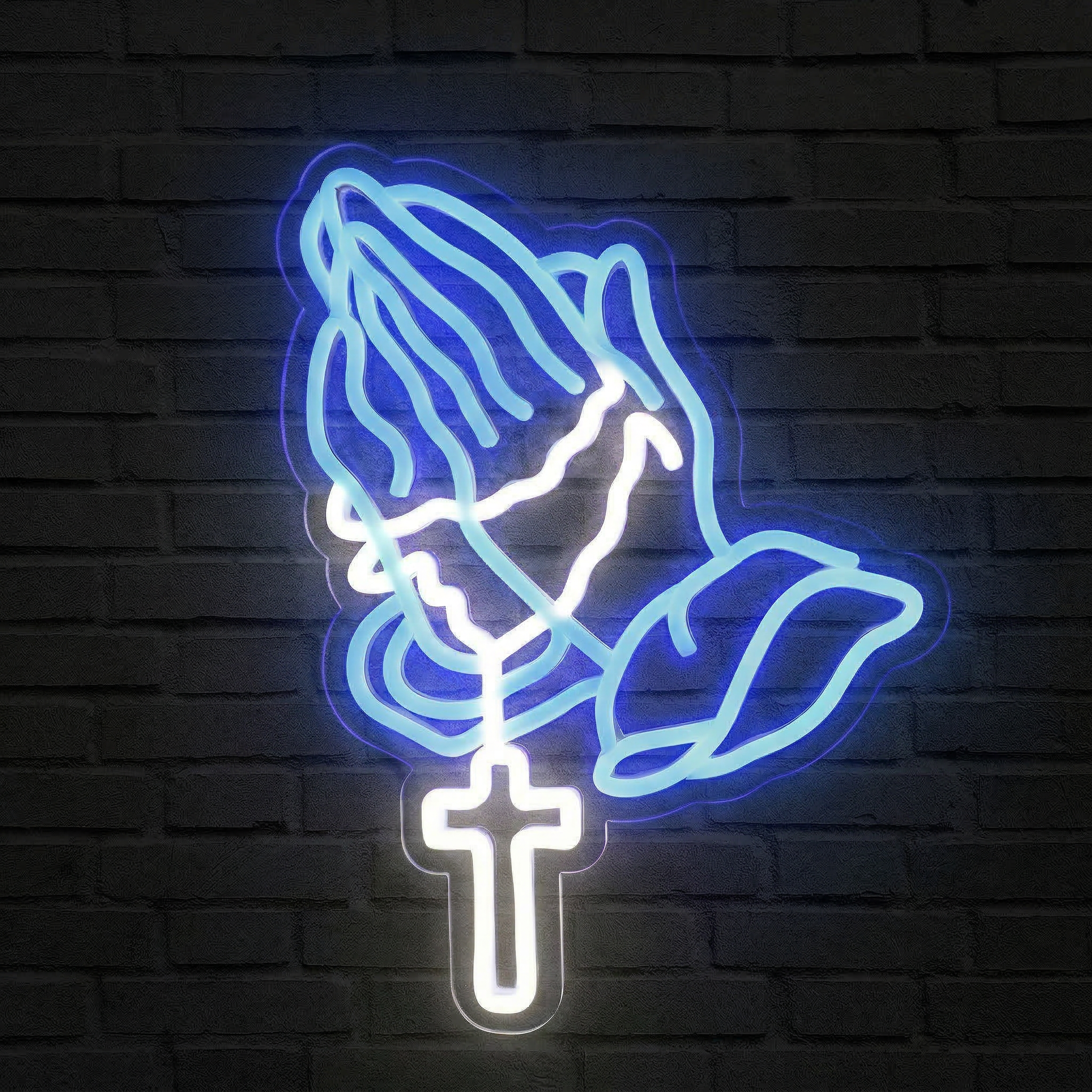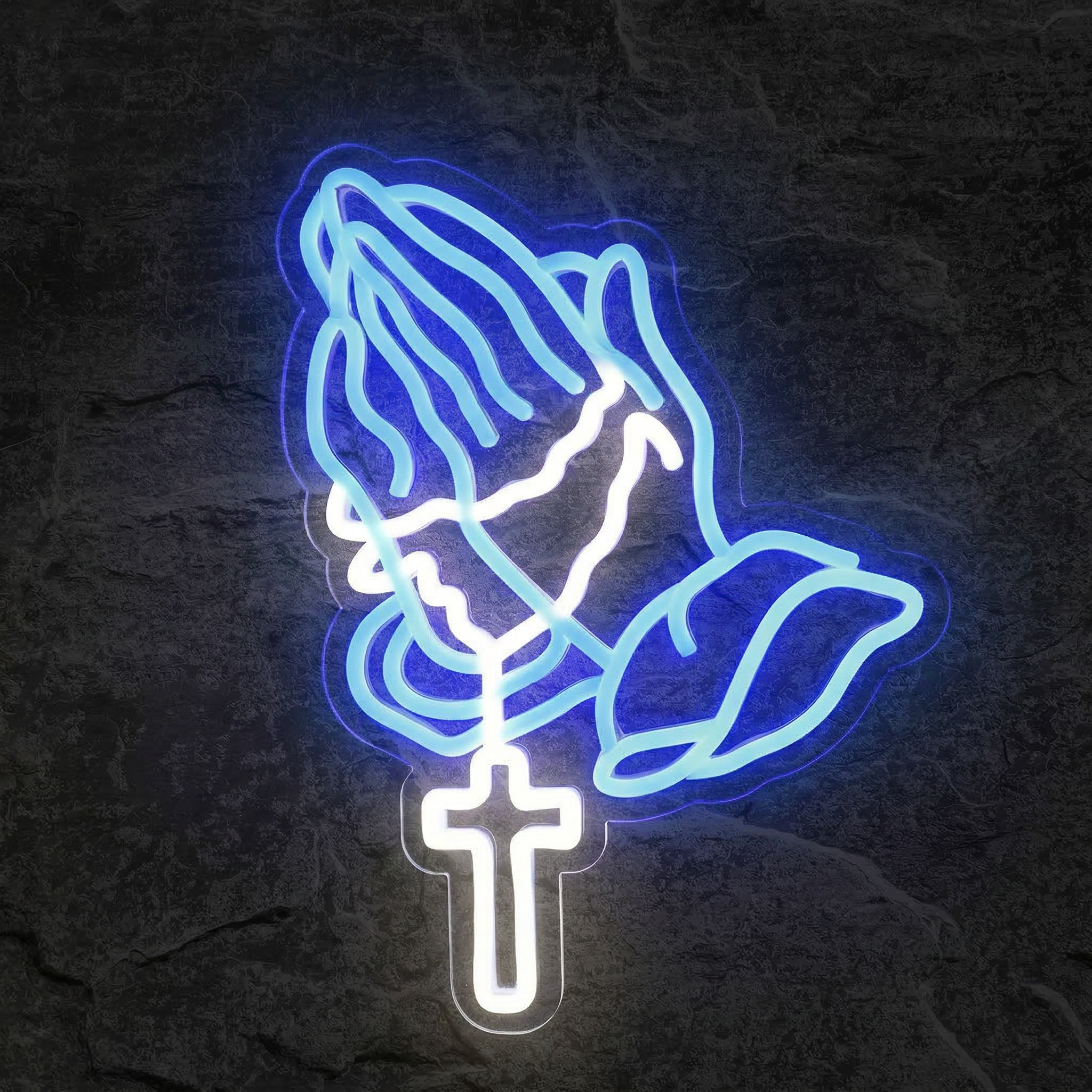 Chez NeonStar, chaque néon est fabriqué avec des tubes LED flexibles de haute qualité, montés sur un fond acrylique transparent découpé au laser avec une précision millimétrée. Le résultat : une esthétique soignée où le néon semble littéralement flotter sur votre mur, comme suspendu dans l'espace. Les détails des mains jointes et du chapelet sont rendus avec une fidélité remarquable, donnant vie à ce symbole sacré avec une clarté lumineuse saisissante.