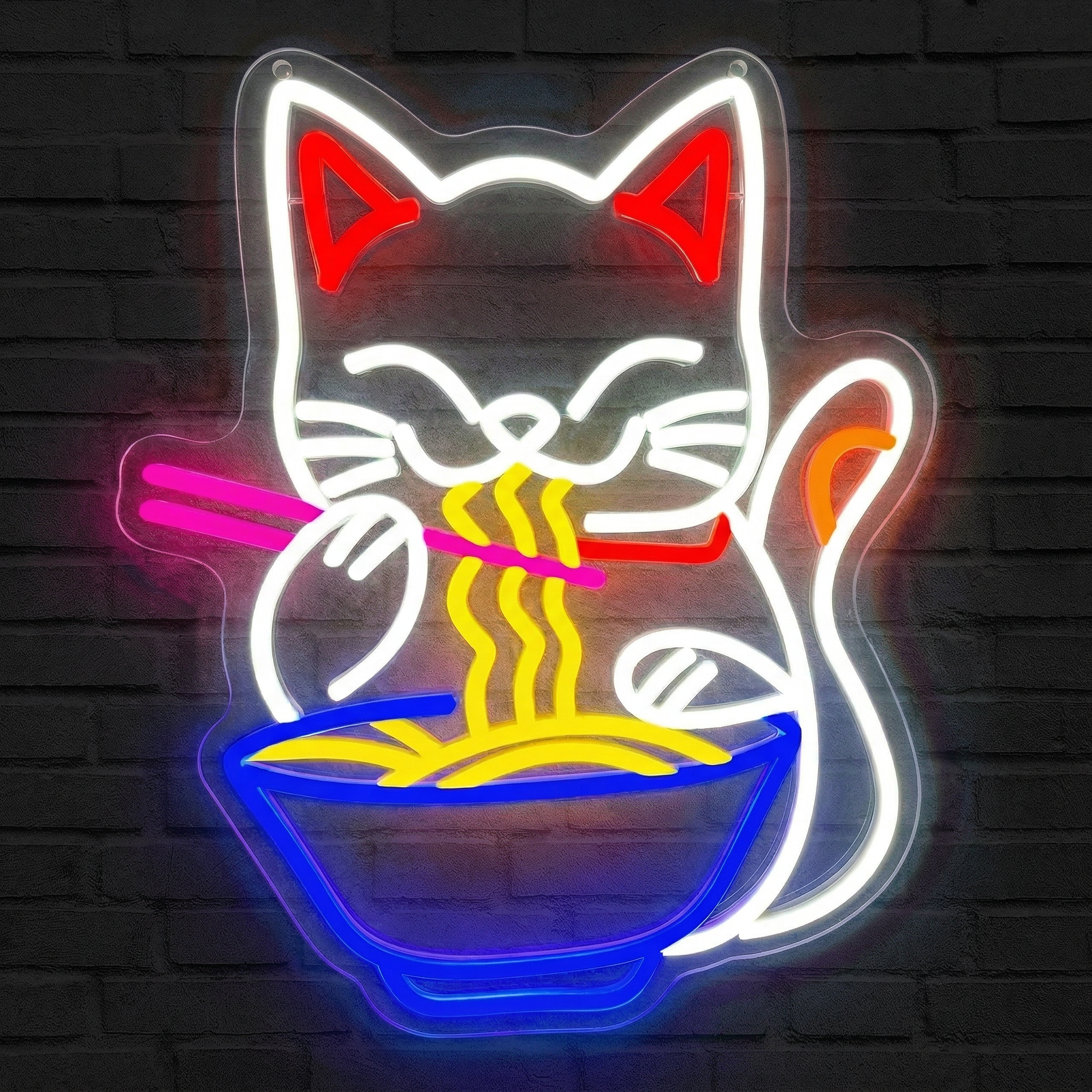 Dessiné avec soin pour capturer chaque détail de la scène — les baguettes, les nouilles, les oreilles du chat dressées —, ce néon est bien plus qu'une simple lampe. C'est un objet de déco à part entière, qui parle aussi bien aux amateurs de mangas qu'aux passionnés de street food japonaise, aux fans de chats ou aux amoureux de ramen. Un design universel dans son attrait, unique dans son exécution.