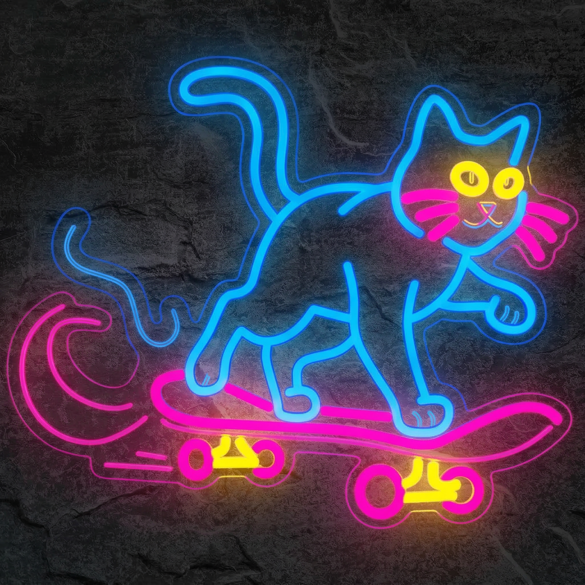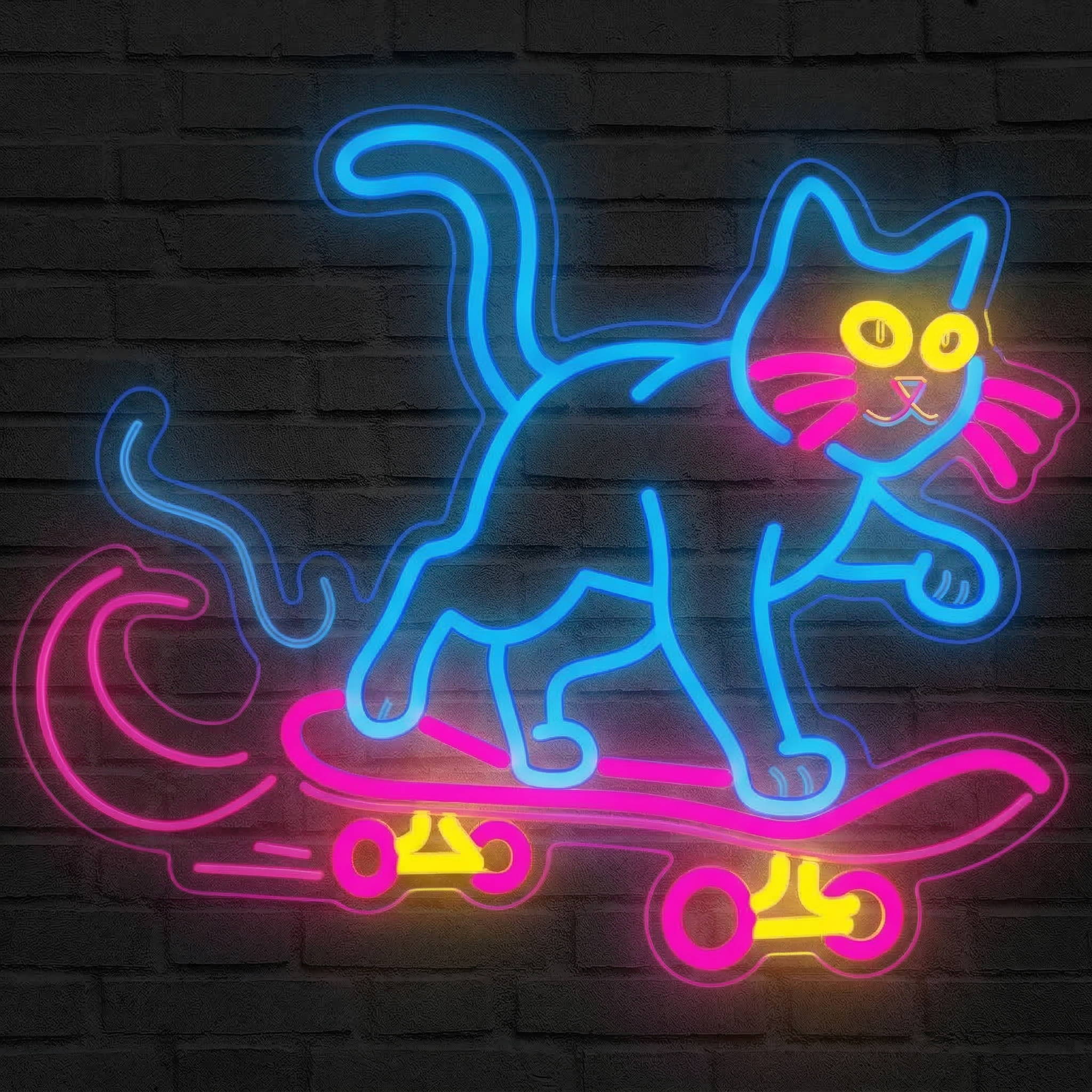 Le Néon Chat Skateboard combine trois couleurs distinctes : des contours bleus lumineux pour la silhouette du chat, des yeux jaunes brillants pour le regard expressif du félin, et une planche rose-violette pour la touche street art finale. L'ensemble forme un néon multicolore cohérent et très impactant visuellement.