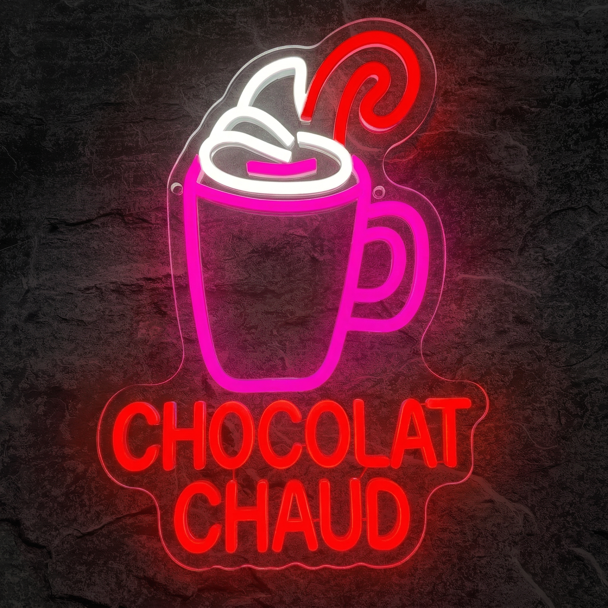 Il y a des objets qui ne se contentent pas de décorer — ils créent une atmosphère entière. Notre Néon Chocolat Chaud fait partie de cette rare catégorie. Avec sa tasse rose vif, sa mousse blanche lumineuse et sa vapeur stylisée qui s'élève en volutes colorées, ce néon évoque instantanément les plaisirs simples de l'hiver : les mains réchauffées autour d'un mug, l'odeur du cacao, la douceur des soirées cocooning. Accrochez-le dans votre cuisine, votre salon ou votre commerce, et regardez la magie opérer.