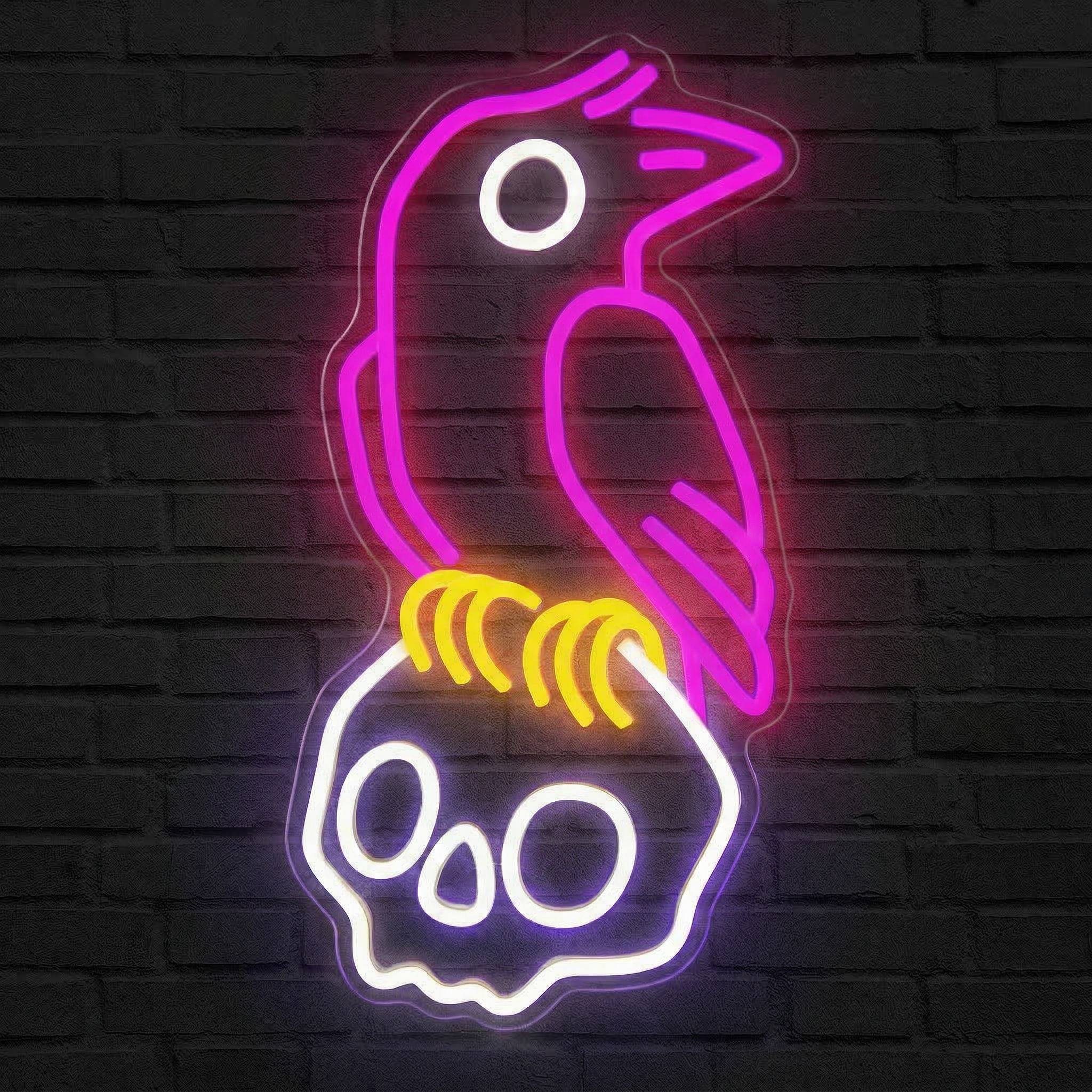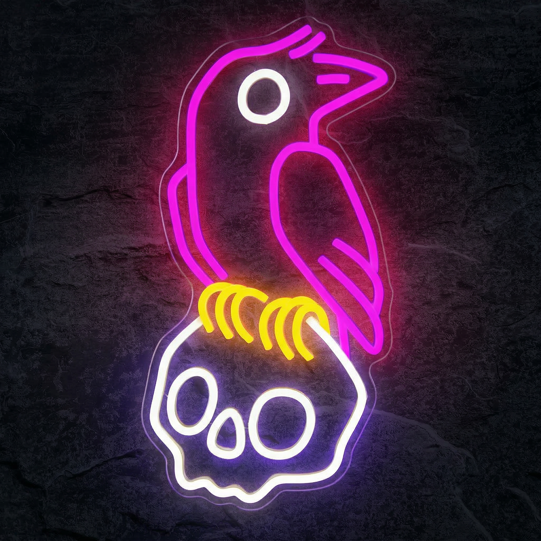 Le néon utilise trois couleurs distinctes : le violet pour les contours du corbeau, le blanc pour les orbites creuses du crâne, et le jaune vif pour les pattes. Cette combinaison crée un contraste saisissant qui rend le design particulièrement spectaculaire dans l'obscurité.