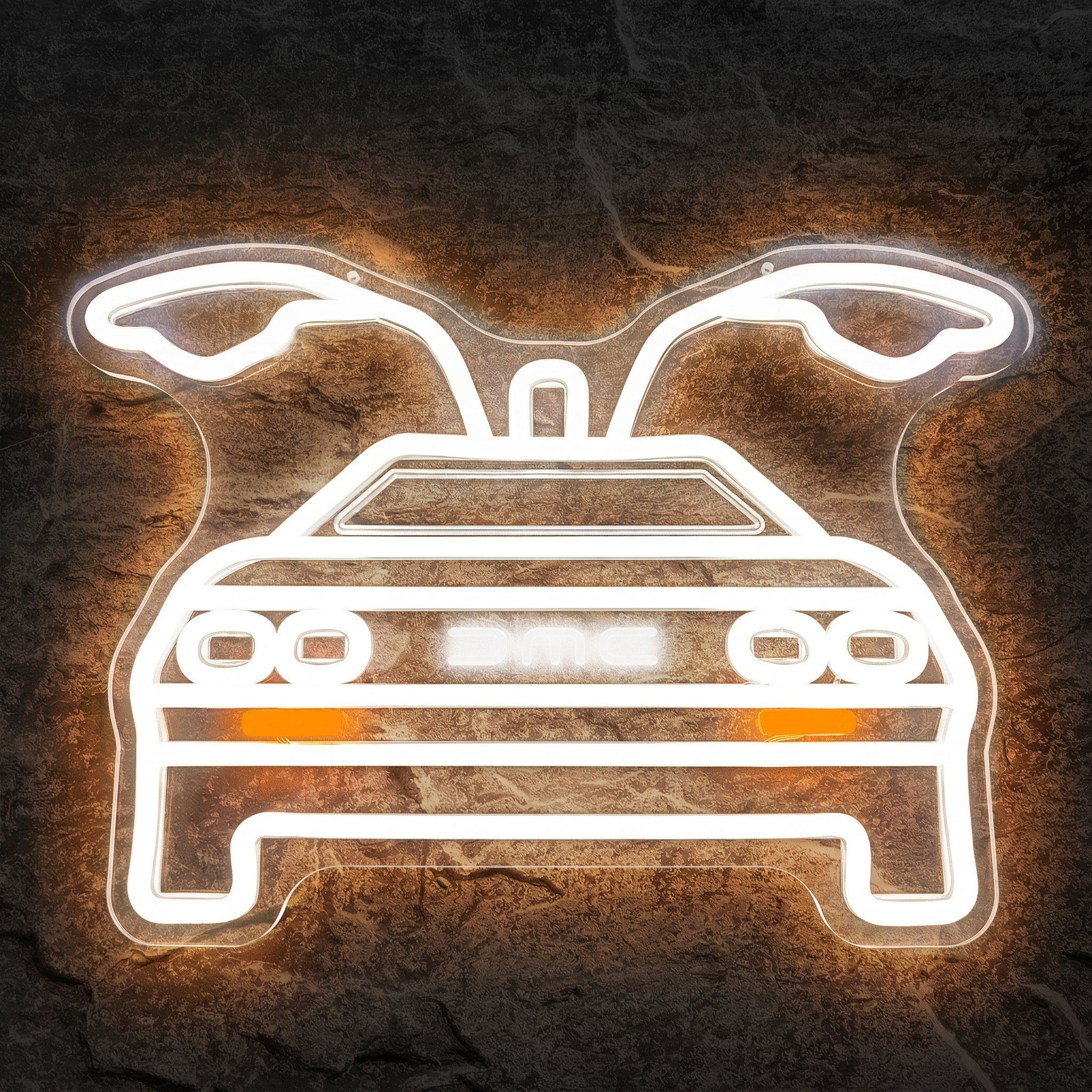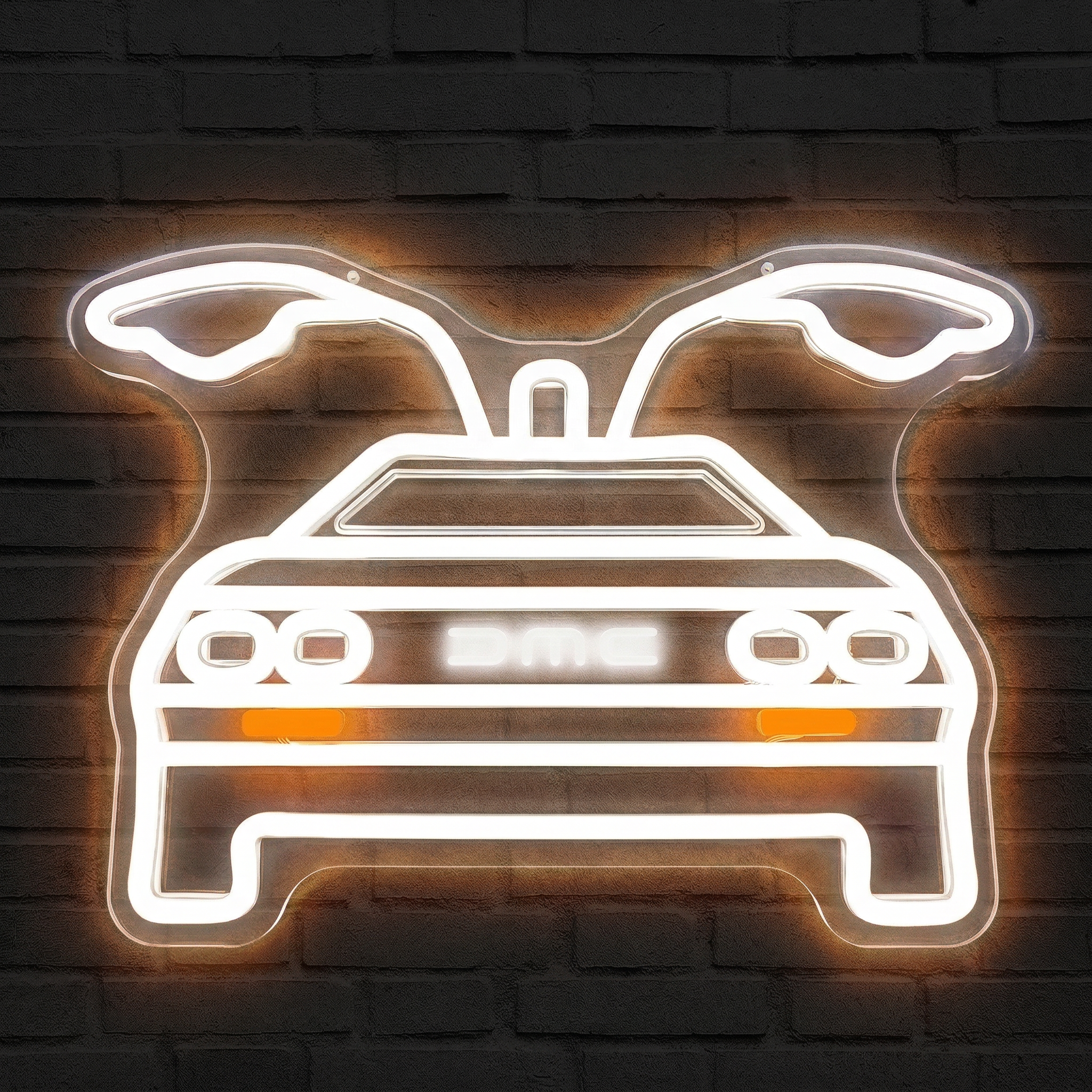 Chez NeonStar, nous avons travaillé chaque détail de ce design pour que la silhouette soit immédiatement reconnaissable. Le contour blanc lumineux restitue fidèlement les lignes angulaires si caractéristiques de la carrosserie, tandis qu'une bande orange vif vient souligner l'ensemble avec ce contraste chaud et électrique qui rappelle les enseignes des arcades et des drive-ins des eighties. Le résultat est saisissant : une pièce à la fois décorative, nostalgique et visuellement puissante.