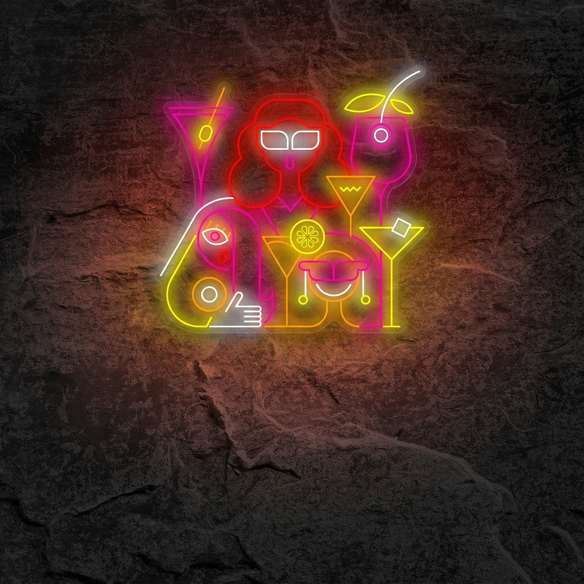 Certains intérieurs ont une âme. Les bars qui font rêver, les lounges qui invitent à s'attarder, les salons où l'on se sent immédiatement bien — ils ont tous un point commun : une lumière qui pose le ton. Notre Néon Femmes au Bar à Cocktails est exactement ça. Une illustration lumineuse, élégante et pleine de vie, qui transforme instantanément n'importe quel espace en lieu de convivialité et de bonne humeur.