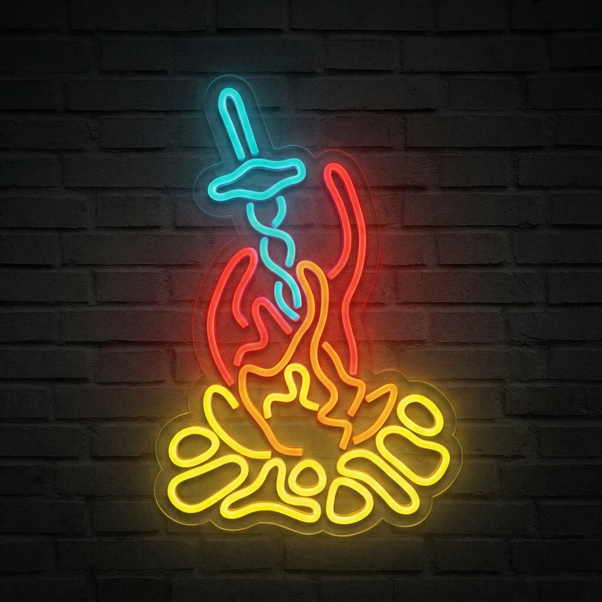 Plongez l'ambiance Dark Souls dans votre pièce avec ce néon feu de camp emblématique : épée bleue lumineuse et flammes rouges-orangées pour les vrais joueurs.