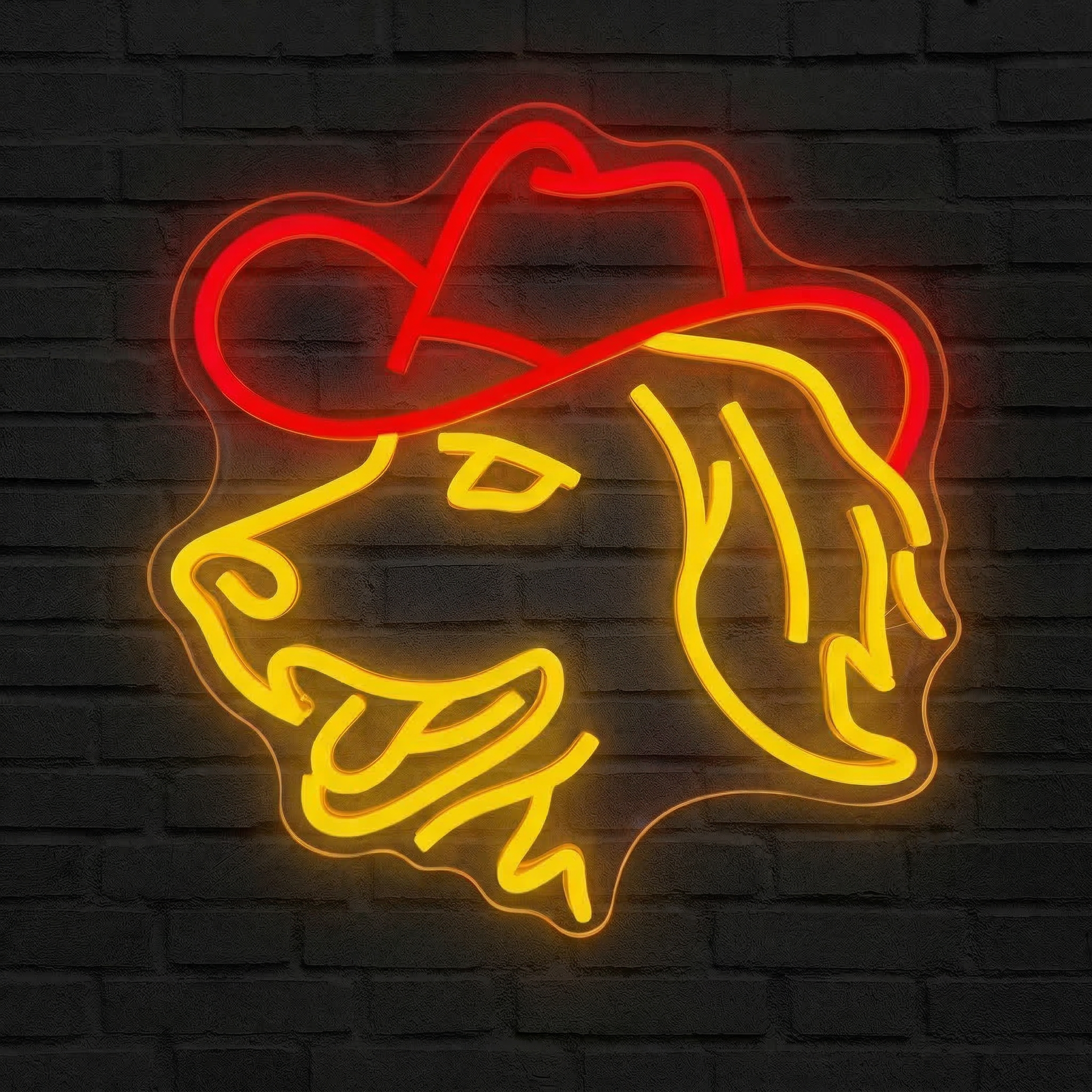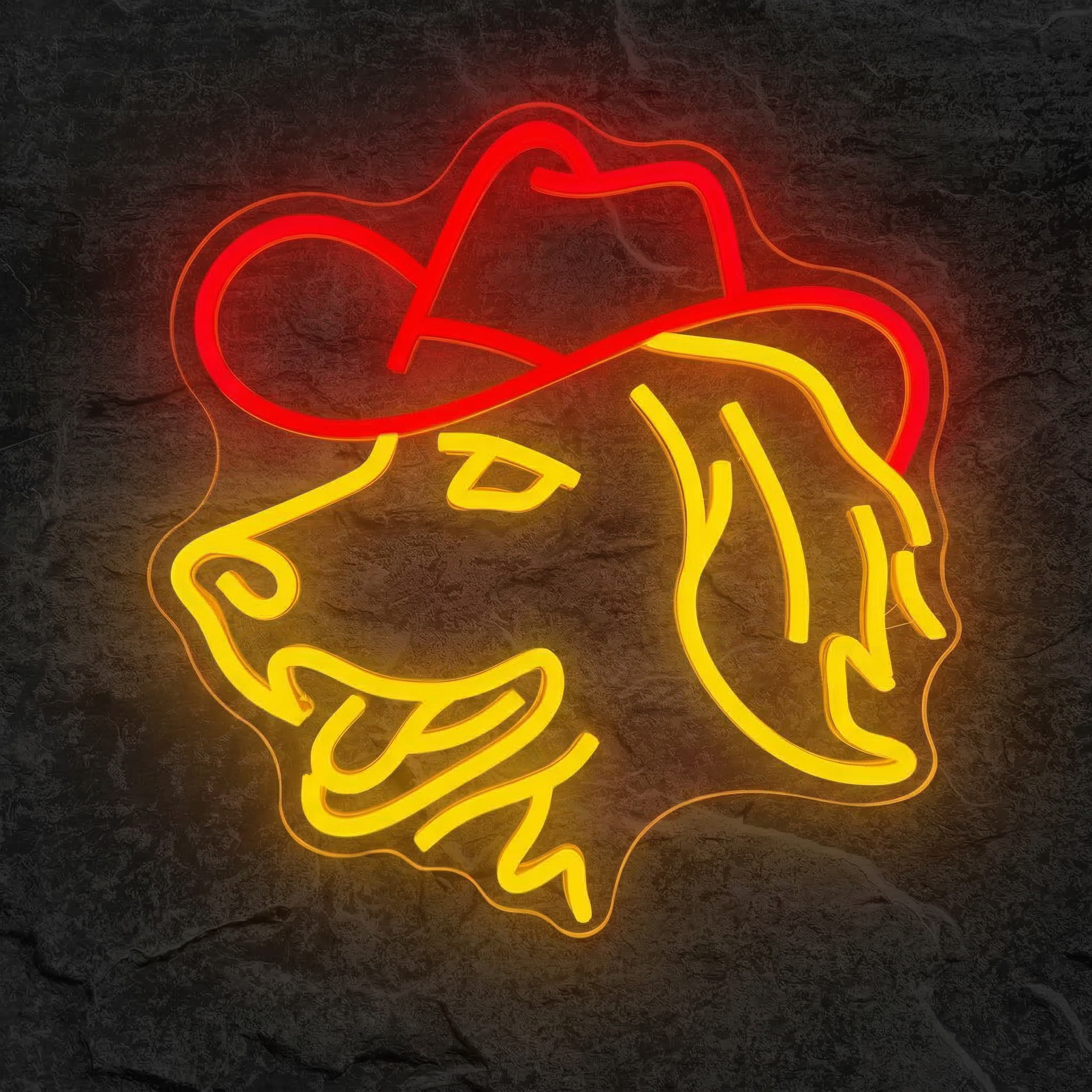 Chez NeonStar, nous avons conçu ce néon pour ceux qui refusent les décorations banales. Les propriétaires de Golden Retriever qui veulent rendre hommage à leur compagnon à quatre pattes, les fans de culture western, les amateurs de déco pop et décalée ou simplement ceux qui veulent apporter une bonne dose de bonne humeur à leur salon, leur chambre ou leur bureau — ce néon est fait pour vous. Son dessin stylisé capture à la perfection l'expression espiègle et attachante du Golden Retriever, chapeau de cowboy vissé sur la tête, prêt à conquérir le Far West.