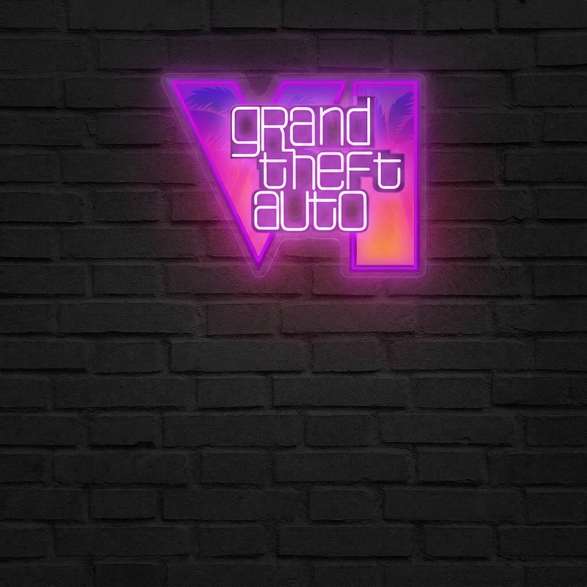 Les lettres « Grand Theft Auto » s'illuminent en blanc éclatant, superposées verticalement dans la typographie emblématique de la franchise. Le résultat est saisissant : un rendu net, contrasté, immédiatement reconnaissable, même de loin. Posé contre un mur sombre, le néon prend une dimension presque cinématographique — exactement l'effet que l'on recherche pour transformer un simple bureau ou une salle de jeux en véritable sanctuaire du gaming.