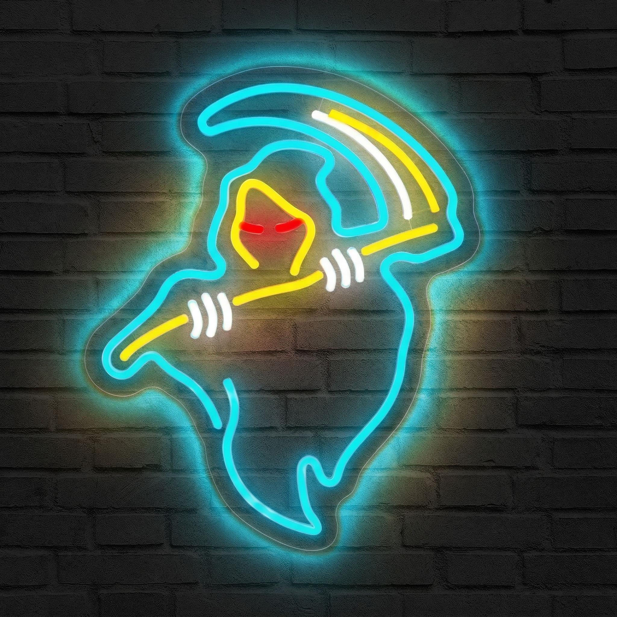 Décorez votre intérieur d'une ambiance gothique intense avec le Néon Grande Faucheuse NeonStar — une silhouette spectrale en bleu cyan, saisissante et envoûtante.