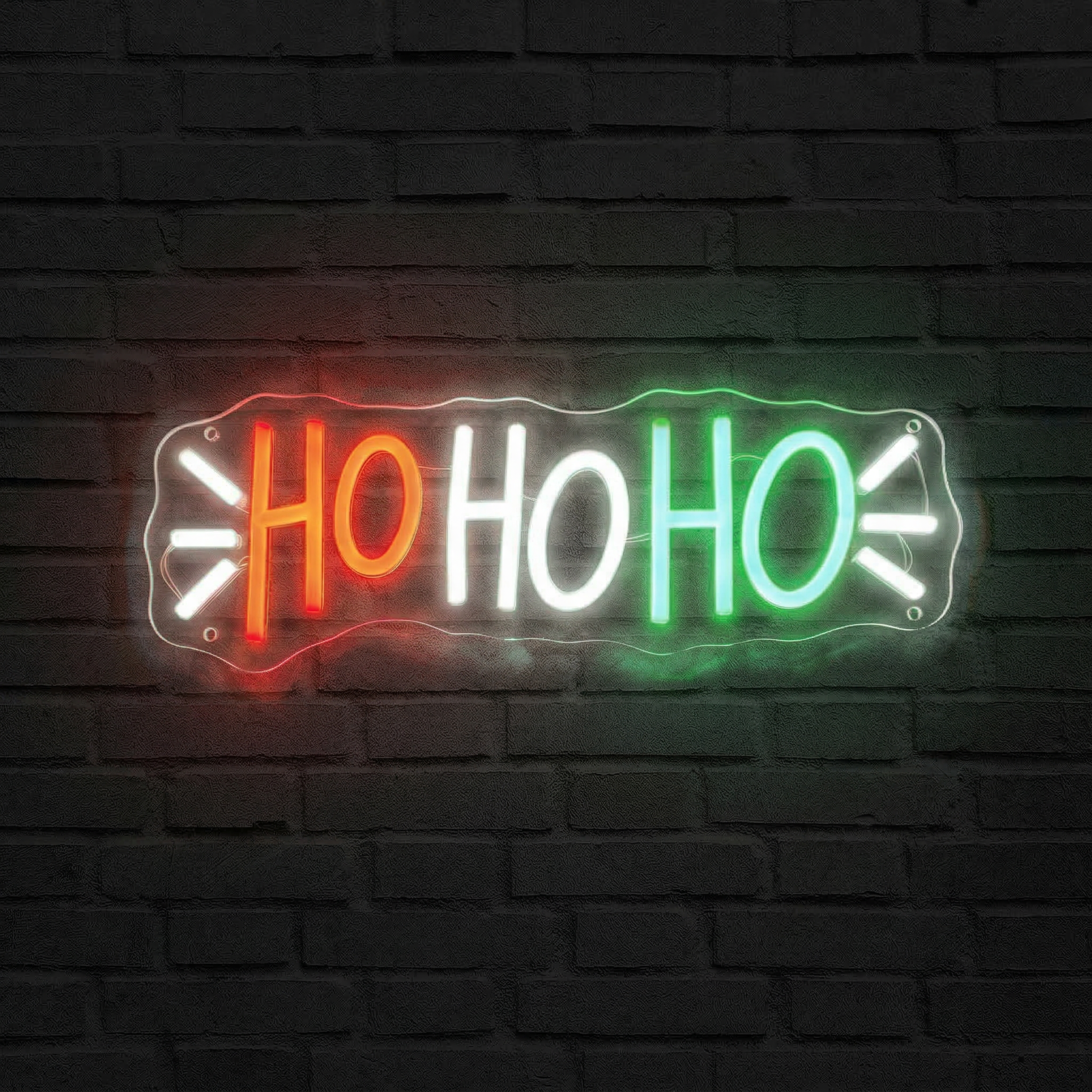 Le Néon Ho Ho Ho NeonStar est disponible en version tricolore rouge, blanc et vert, fidèle à l'esprit de Noël. Chaque « Ho » peut arborer une couleur différente pour un rendu festif et dynamique. Contactez-nous si vous souhaitez une personnalisation particulière.