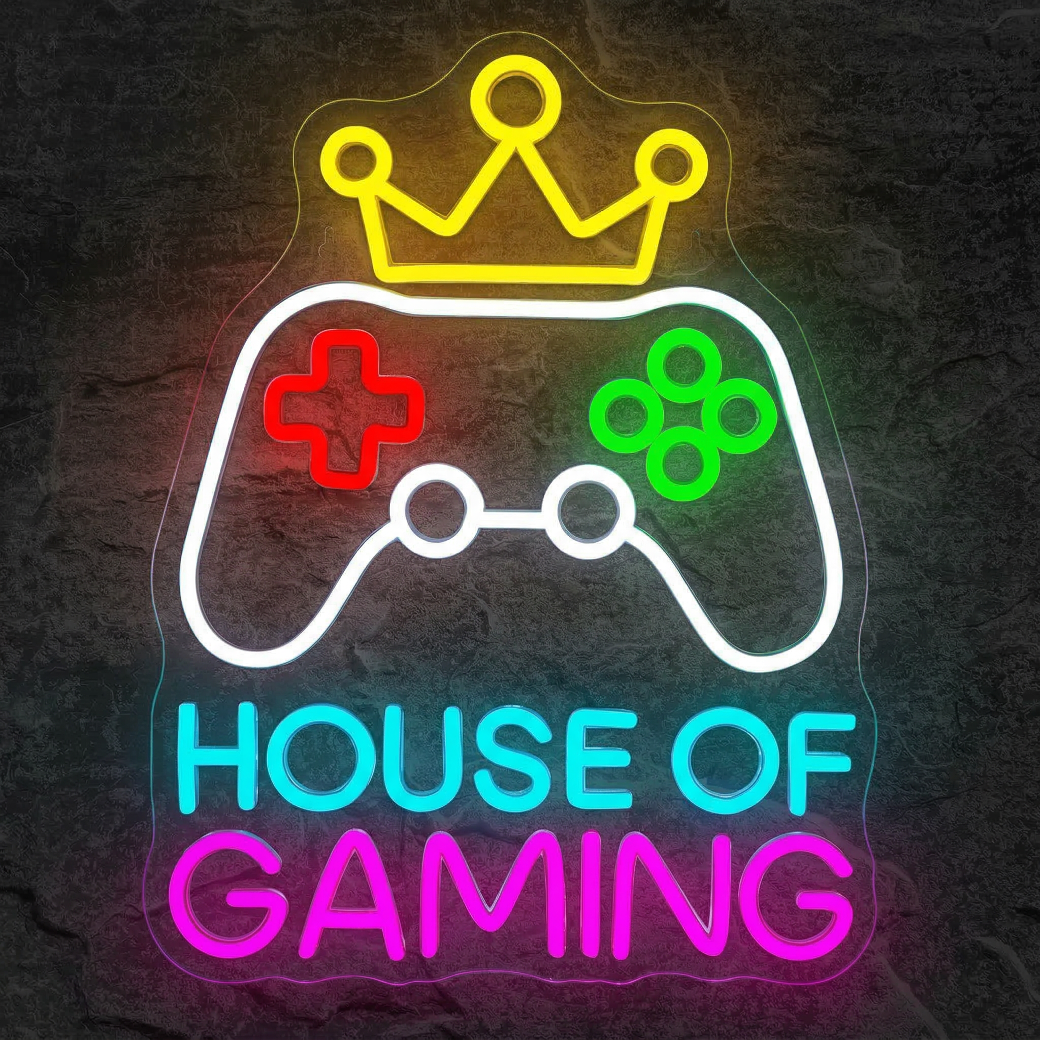 Le design du Néon House of Gaming est pensé pour résonner avec la culture gaming dans toute sa richesse. La couronne rappelle la domination des meilleurs joueurs, la manette évoque des heures de victoires, et la palette de couleurs multicolore — cyan, magenta, rouge et vert — capte parfaitement l'énergie électrisante des écrans et des univers virtuels que vous habitez chaque jour. Ce néon ne décore pas simplement un mur : il raconte qui vous êtes.