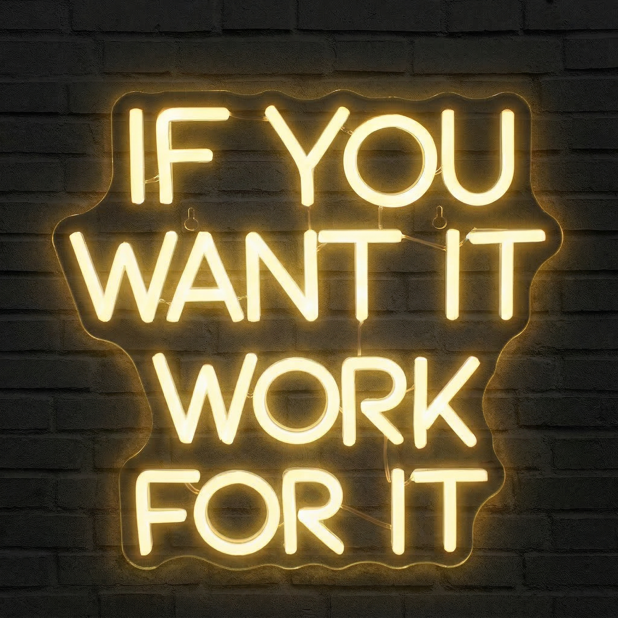 Certaines phrases ont le pouvoir de changer une journée. "If you want it, work for it" en fait partie. Accrochée en lettres lumineuses d'un jaune vif et électrique, cette citation devient bien plus qu'un simple élément décoratif — c'est un rappel quotidien que chaque objectif se mérite, chaque victoire se construit. Notre Néon « If You Want It Work For It » est conçu pour ceux qui refusent la médiocrité et veulent que leur espace de vie ou de travail le reflète.