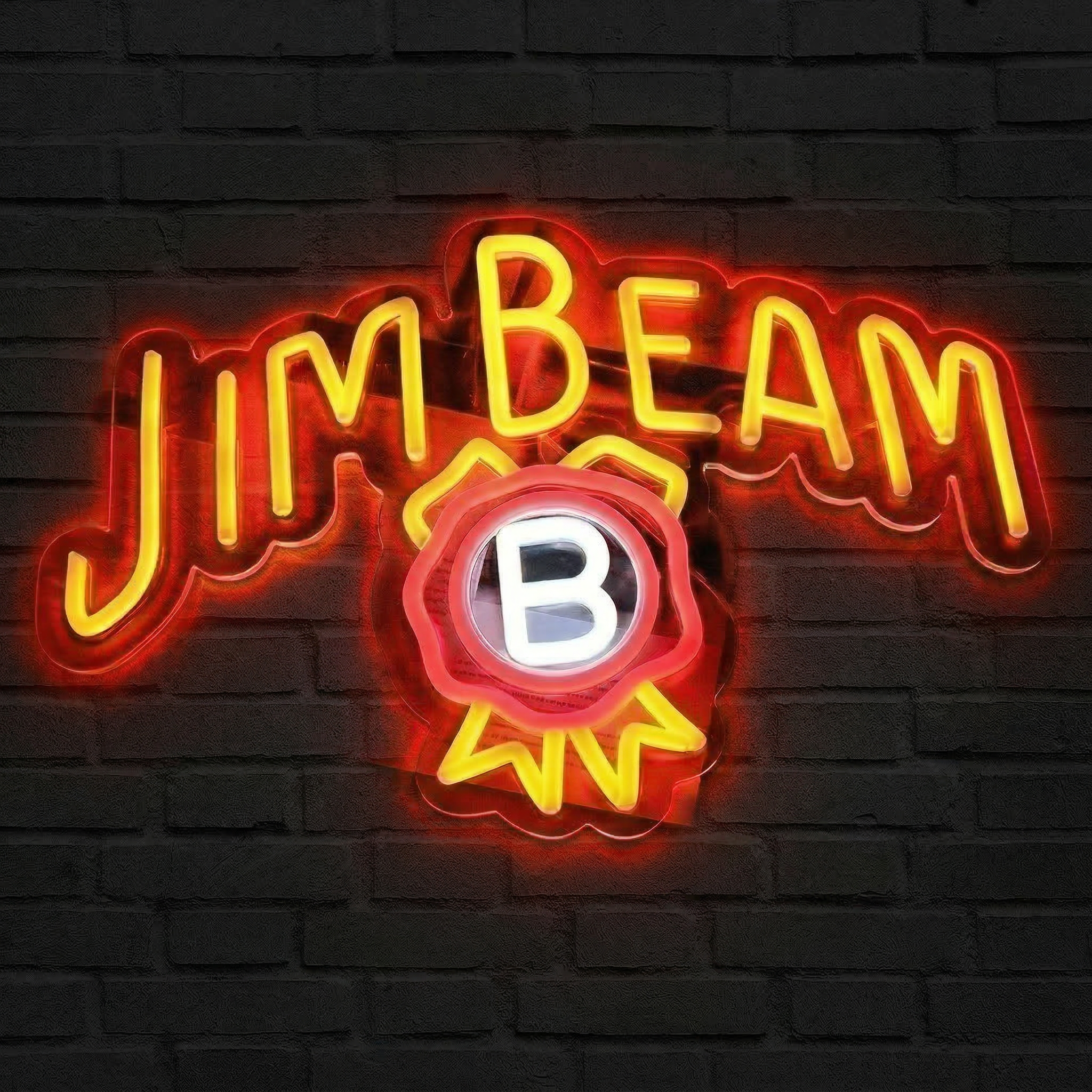 Le logo Jim Beam reproduit ici avec précision déploie ses teintes jaune vif et ses accents orange et blanc caractéristiques dans un rendu lumineux saisissant. Chaque courbe du lettrage, chaque détail du sceau de la distillerie brille avec une intensité maîtrisée, exactement comme vous vous en souvenez. Ce n'est pas une simple décoration — c'est une pièce maîtresse qui raconte une histoire dès le premier regard.