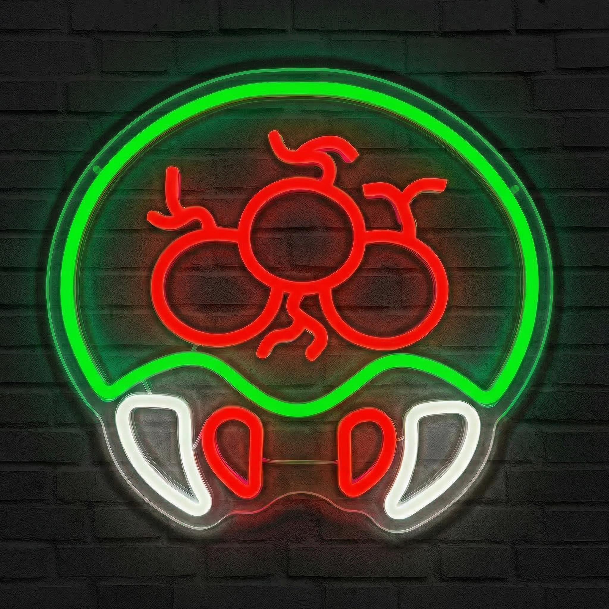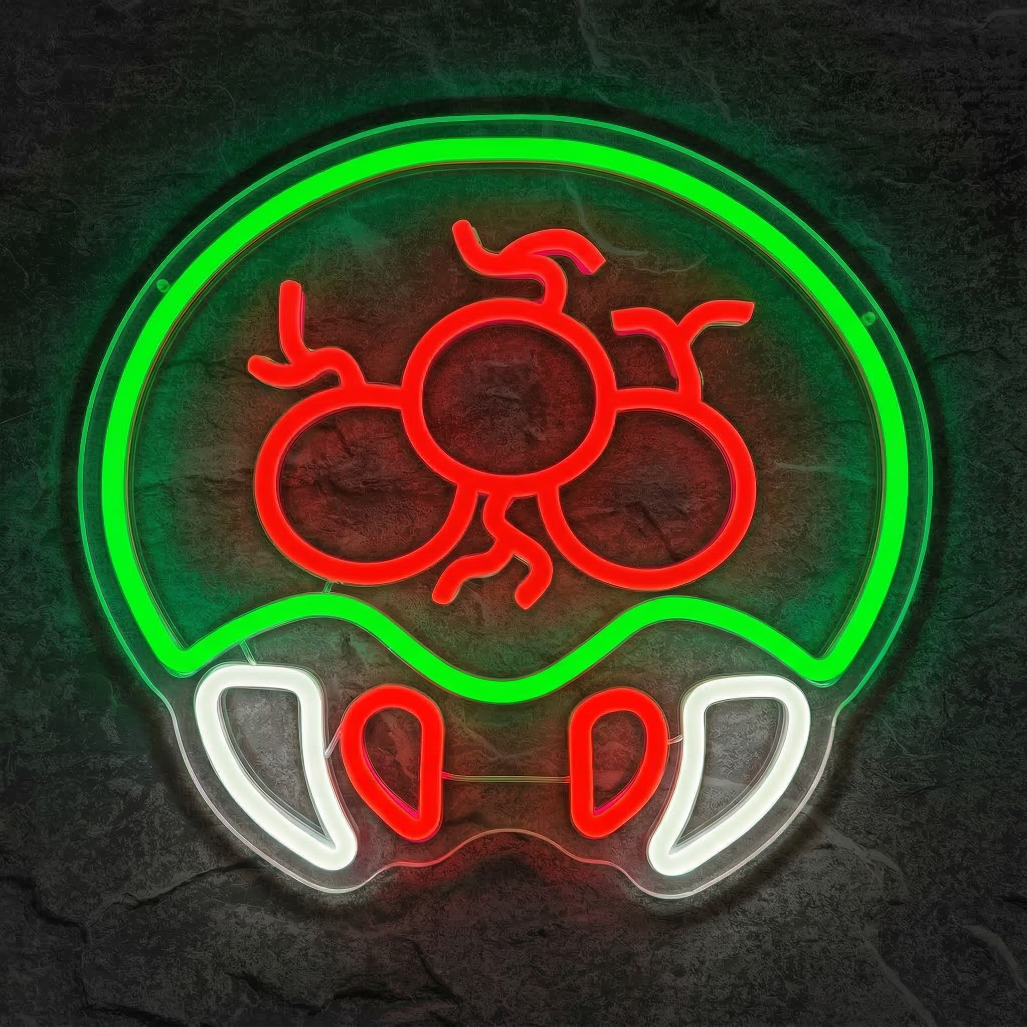 Chaque courbe de ce néon a été pensée pour retranscrire fidèlement la silhouette iconique de la larve Métroïde. Son corps central baigné d'un vert translucide intense, ses tentacules aux reflets rouges et ses crocs blancs acérés — tout est là, lumineux, vibrant, prêt à coloniser votre mur. Le résultat est saisissant : même éteint, ce néon est une œuvre. Allumé, il transforme instantanément n'importe quelle pièce en sanctuaire geek de premier ordre.