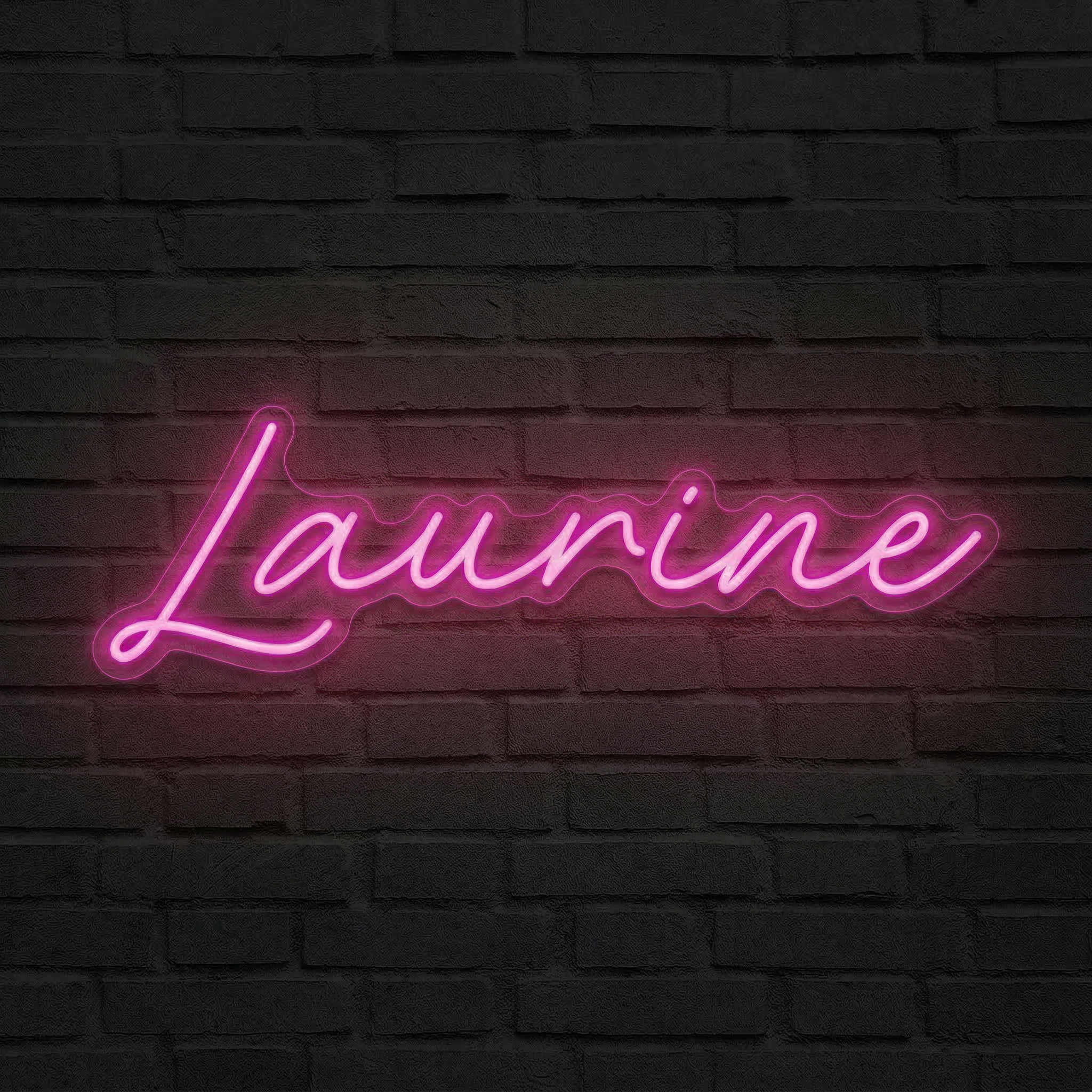 Offrez un néon prénom personnalisé au prénom Laurine, écrit en police script élégante et illuminé d'une lumière rose douce et envoûtante.