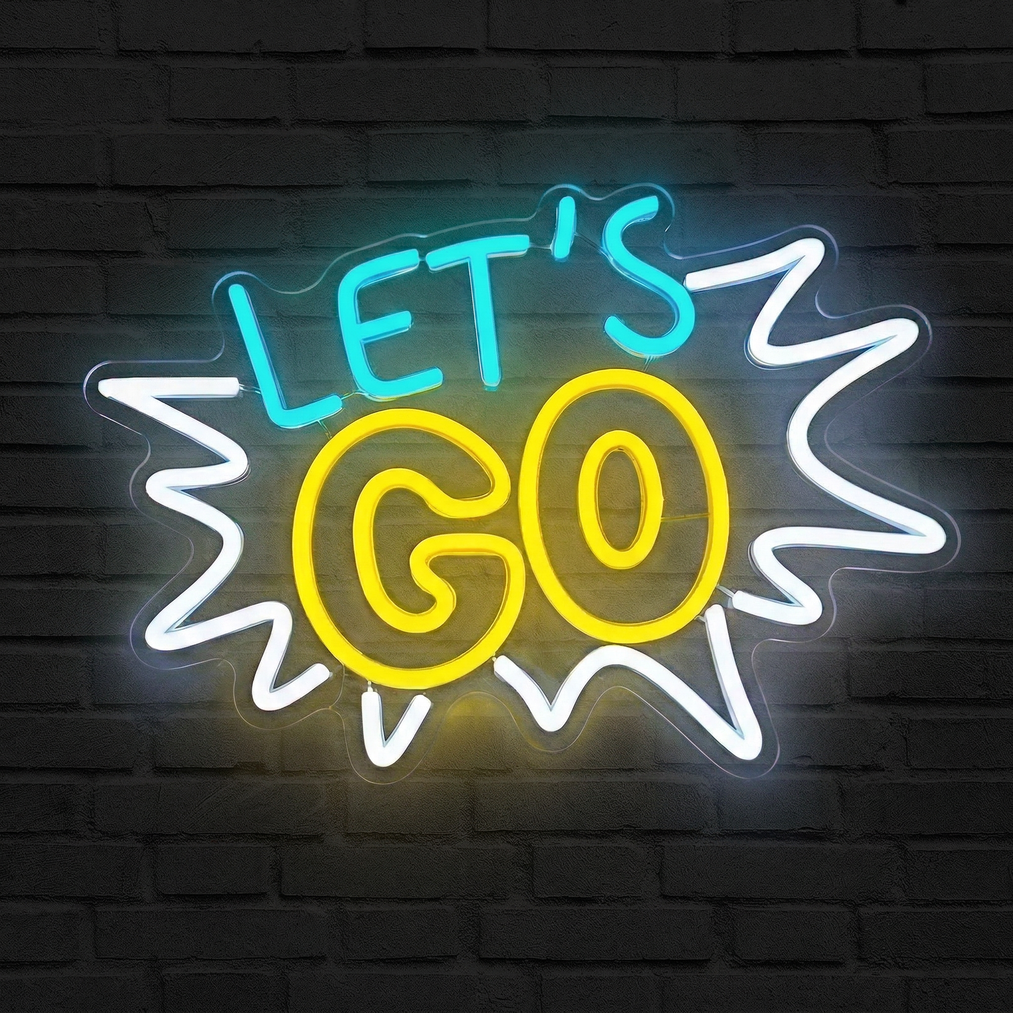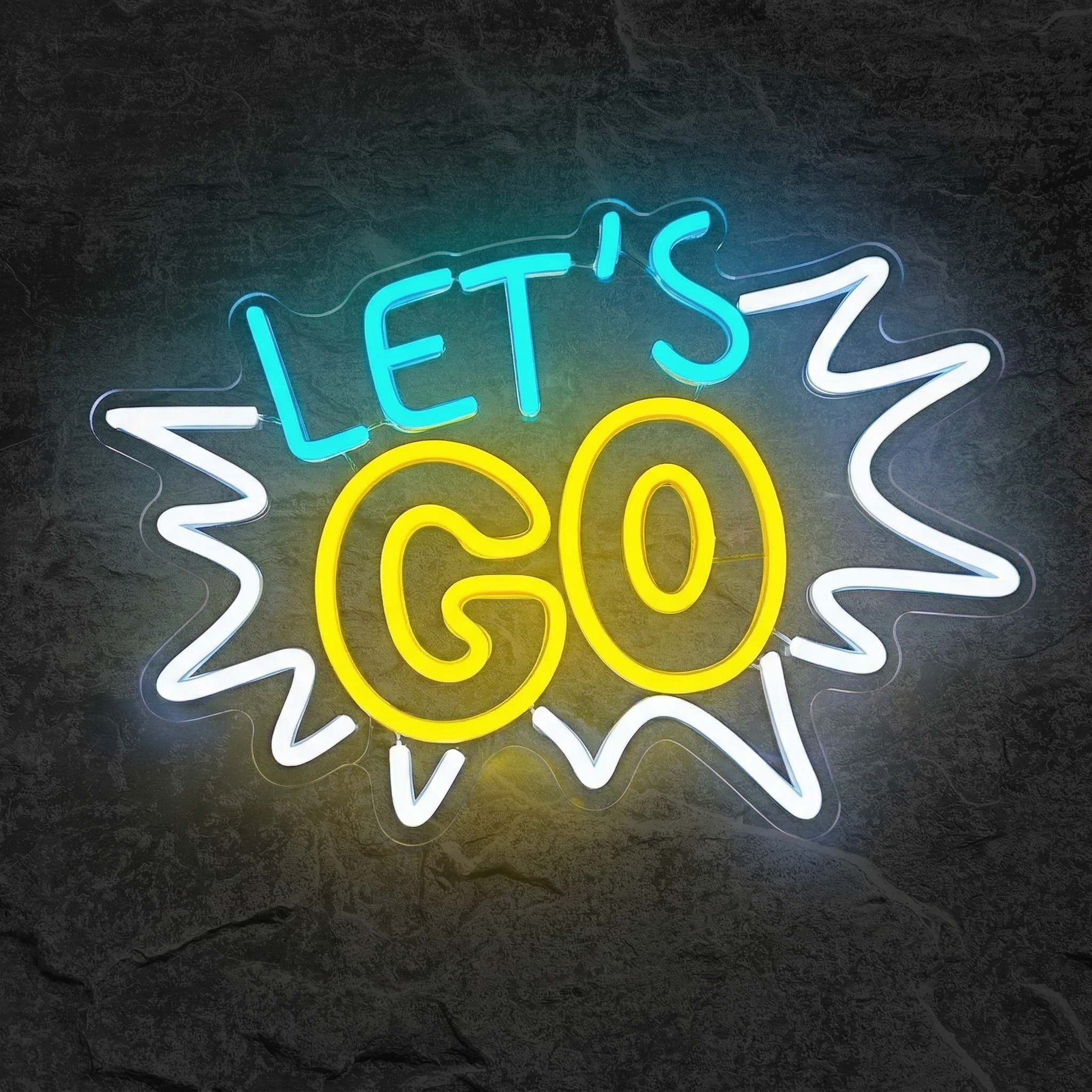L'esthétique de ce néon est pensée jusqu'au moindre détail. "LET'S" s'illumine dans un cyan vif et tranchant, tandis que "GO" explose dans un jaune intense et dynamique. Le tout est souligné d'un contour blanc qui renforce le contraste et donne à l'ensemble une profondeur visuelle saisissante. C'est un néon qui ne passe pas inaperçu — et c'est exactement ce qu'on lui demande.
