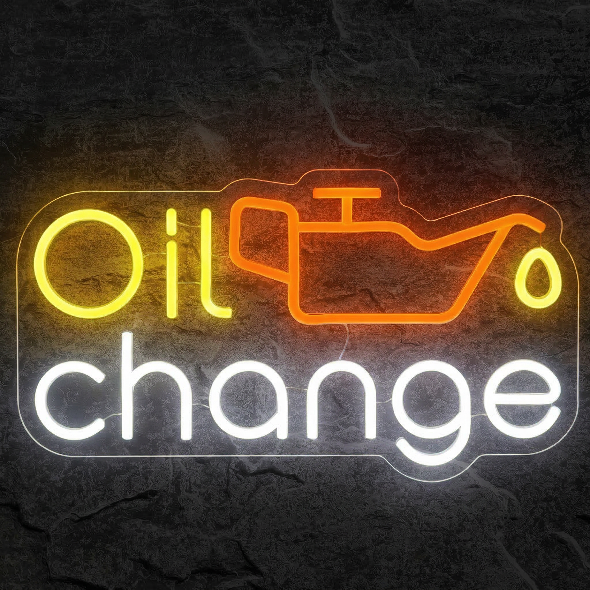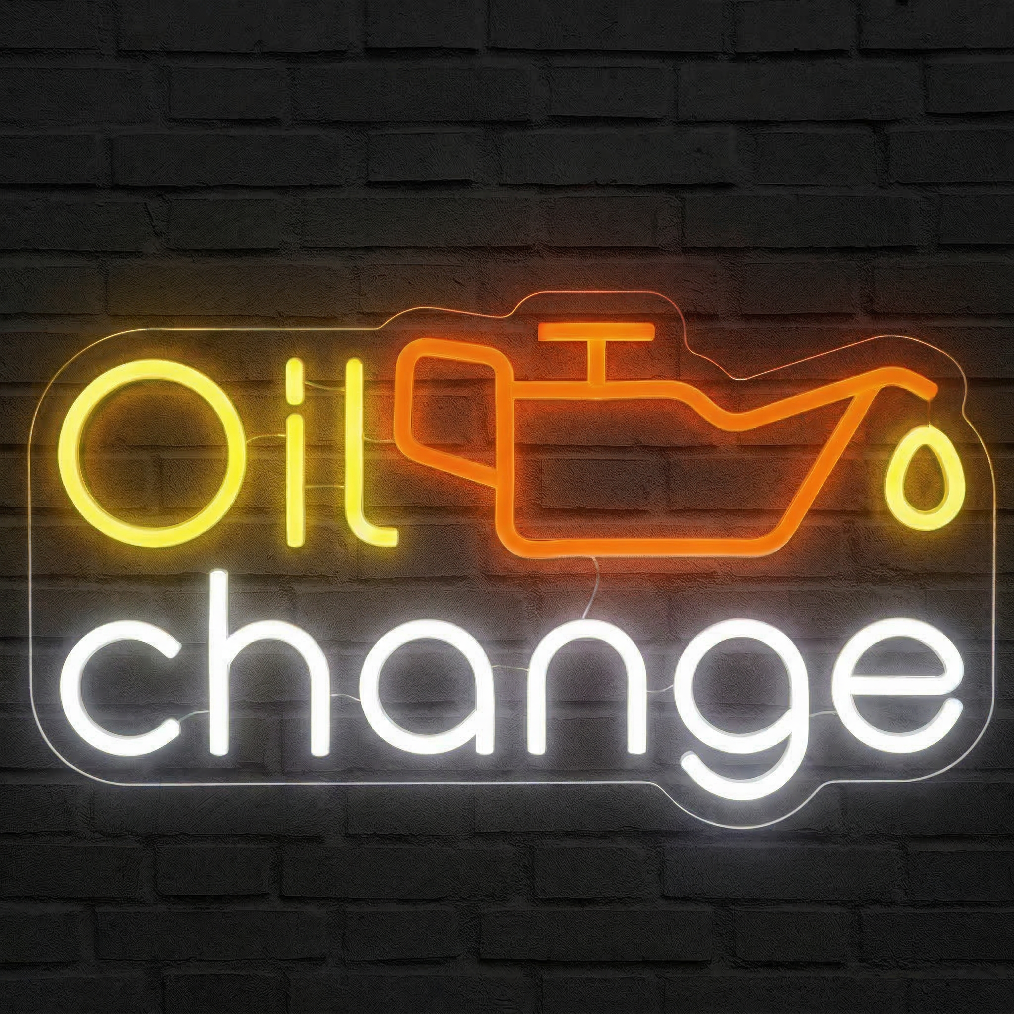 Chez NeonStar, chaque néon est fabriqué avec des tubes LED flexibles de haute qualité montés sur un fond acrylique transparent découpé au laser avec précision. Le résultat est saisissant : les trois couleurs — jaune vif pour "Oil", orange chaleureux pour l'icône du bidon, et blanc éclatant pour "Change" — brillent avec une intensité uniforme et sans point chaud. L'ensemble semble littéralement flotter sur votre mur, à la manière d'une enseigne professionnelle haut de gamme.