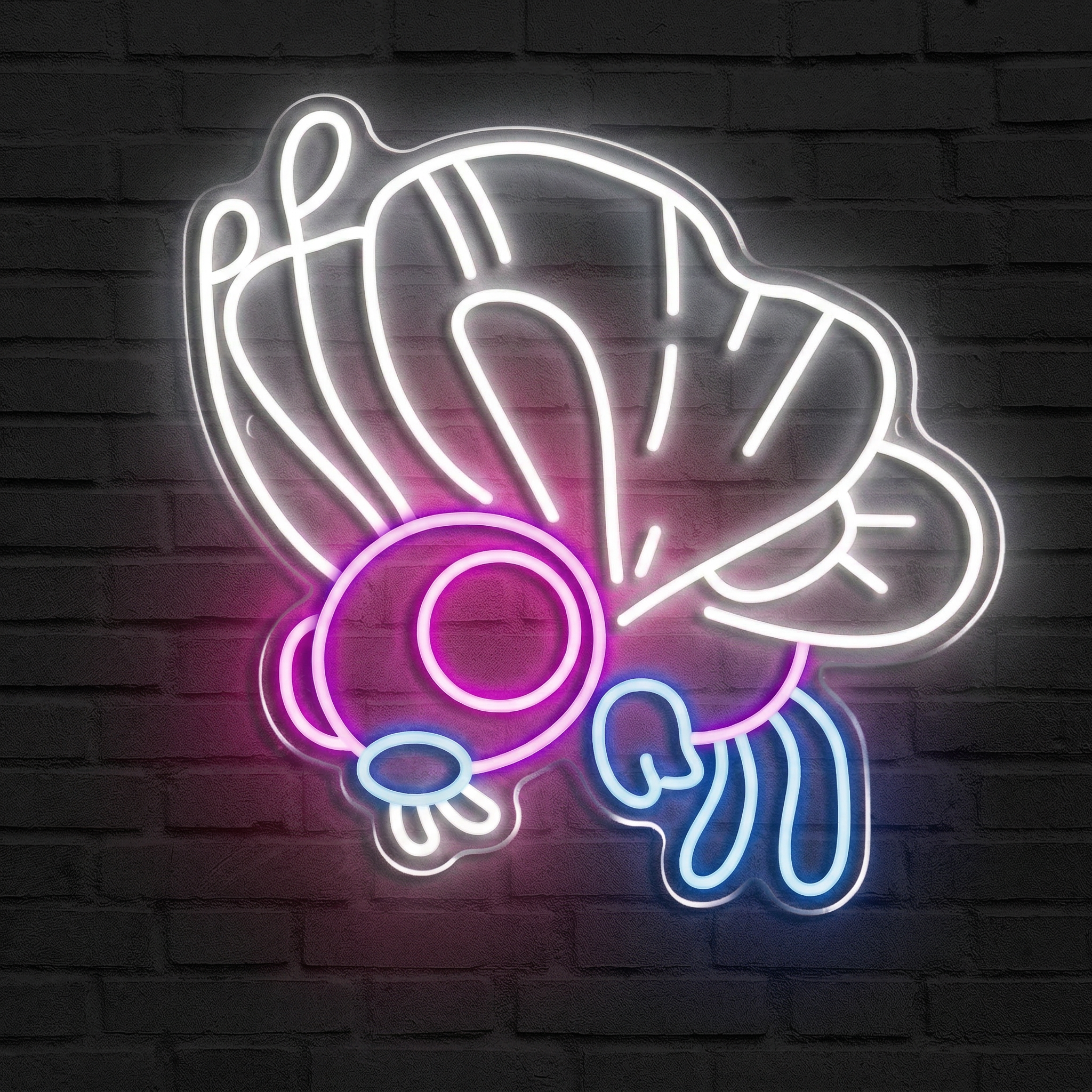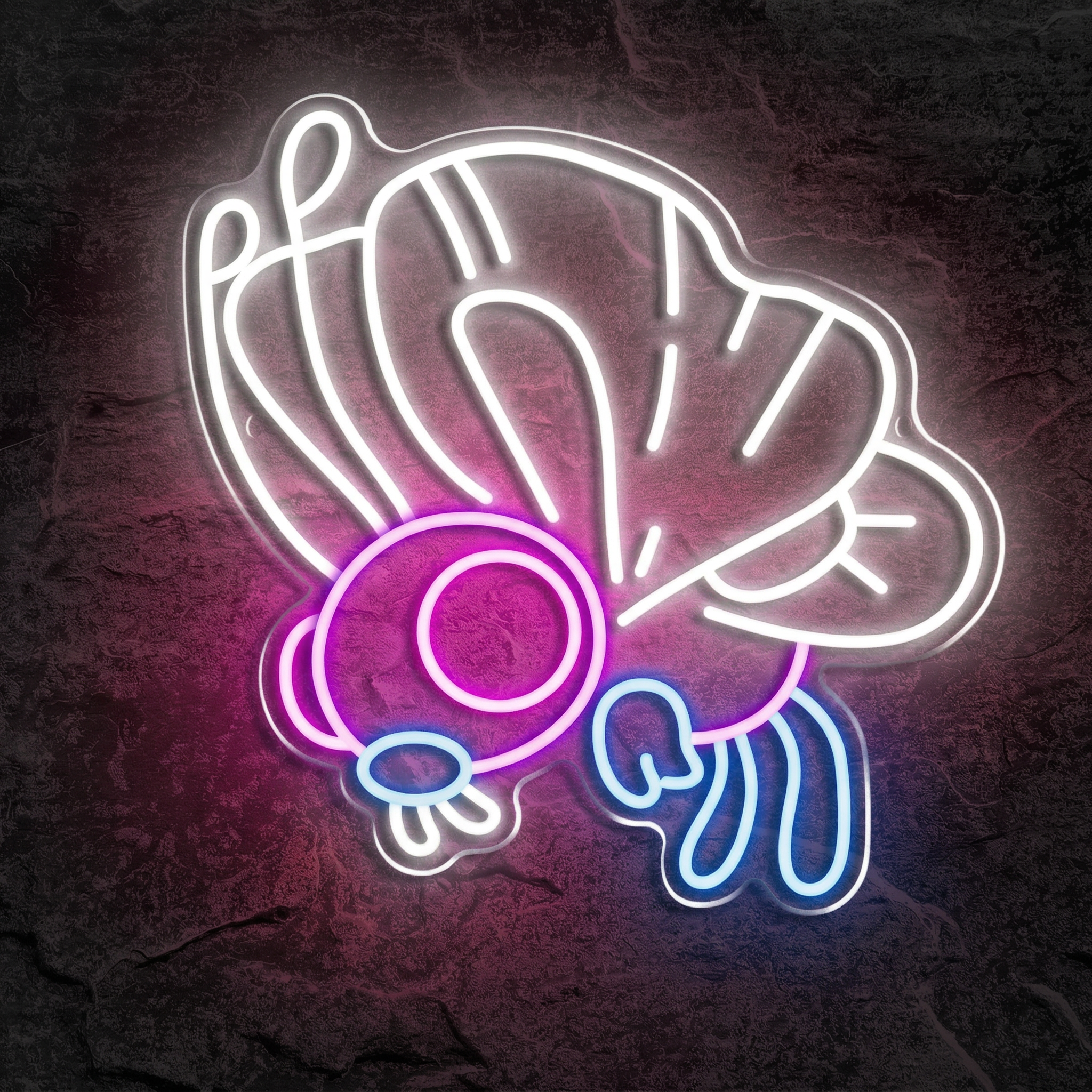 Fabriqué par NeonStar avec des tubes LED flexibles haut de gamme, ce néon reproduit fidèlement la silhouette de Papilusion dans ses couleurs iconiques : blanc lumineux pour les ailes, violet profond pour la tête, touches de bleu pour les détails. Le résultat est saisissant, de jour comme de nuit. Contrairement aux vieux néons à gaz, il ne chauffe pas, ne grésille pas, ne vibre pas. Il illumine, simplement et en silence.