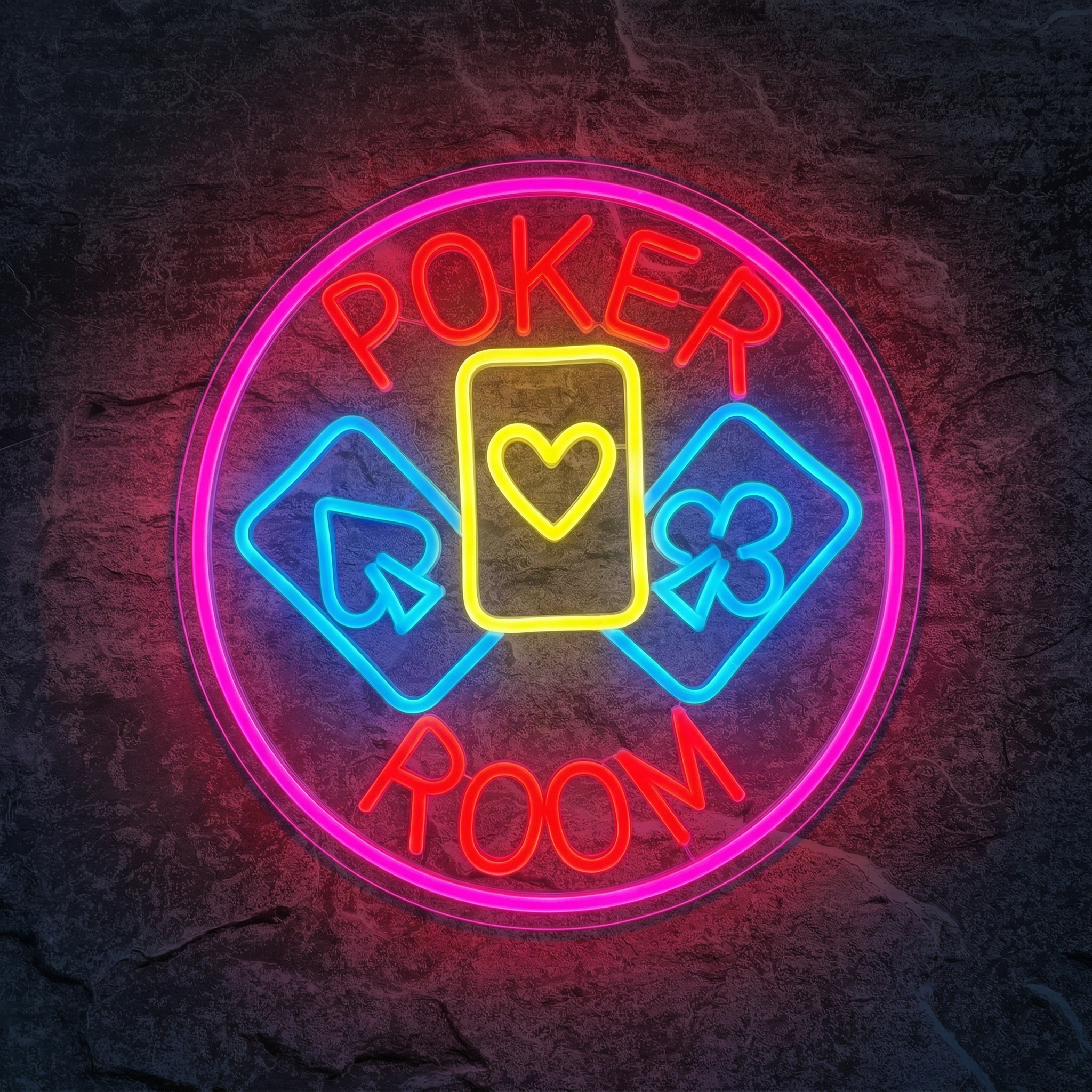 Ambiance casino garantie avec ce néon circulaire Poker Room aux couleurs vives. Idéal pour décorer votre salle de jeux, bar ou man cave avec style.