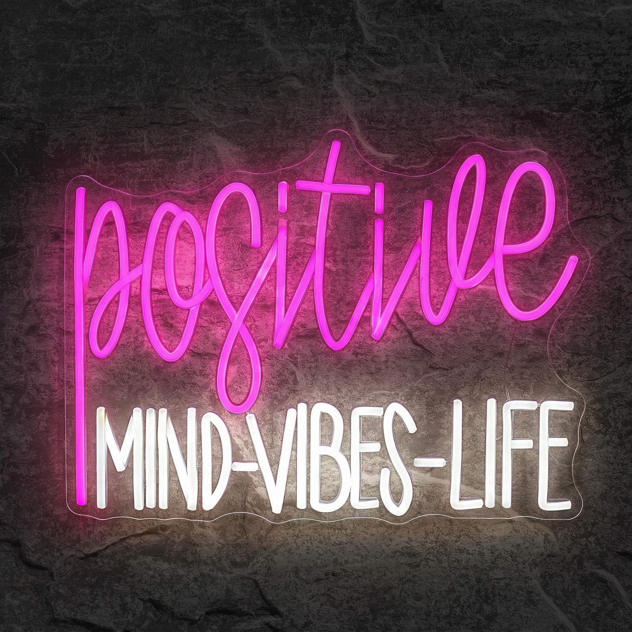 Ce qui rend ce néon véritablement unique, c'est sa dualité typographique. Le mot « Positive » est rendu en écriture cursive rose vif, fluide et élégante, tandis que « Mind », « Vibes » et « Life » s'affichent en caractères droits d'un blanc lumineux. Ce contraste entre les deux styles de police n'est pas qu'esthétique — il crée une hiérarchie visuelle naturelle qui guide l'œil et rend le message encore plus percutant. Le résultat est à la fois moderne, poétique et puissant.