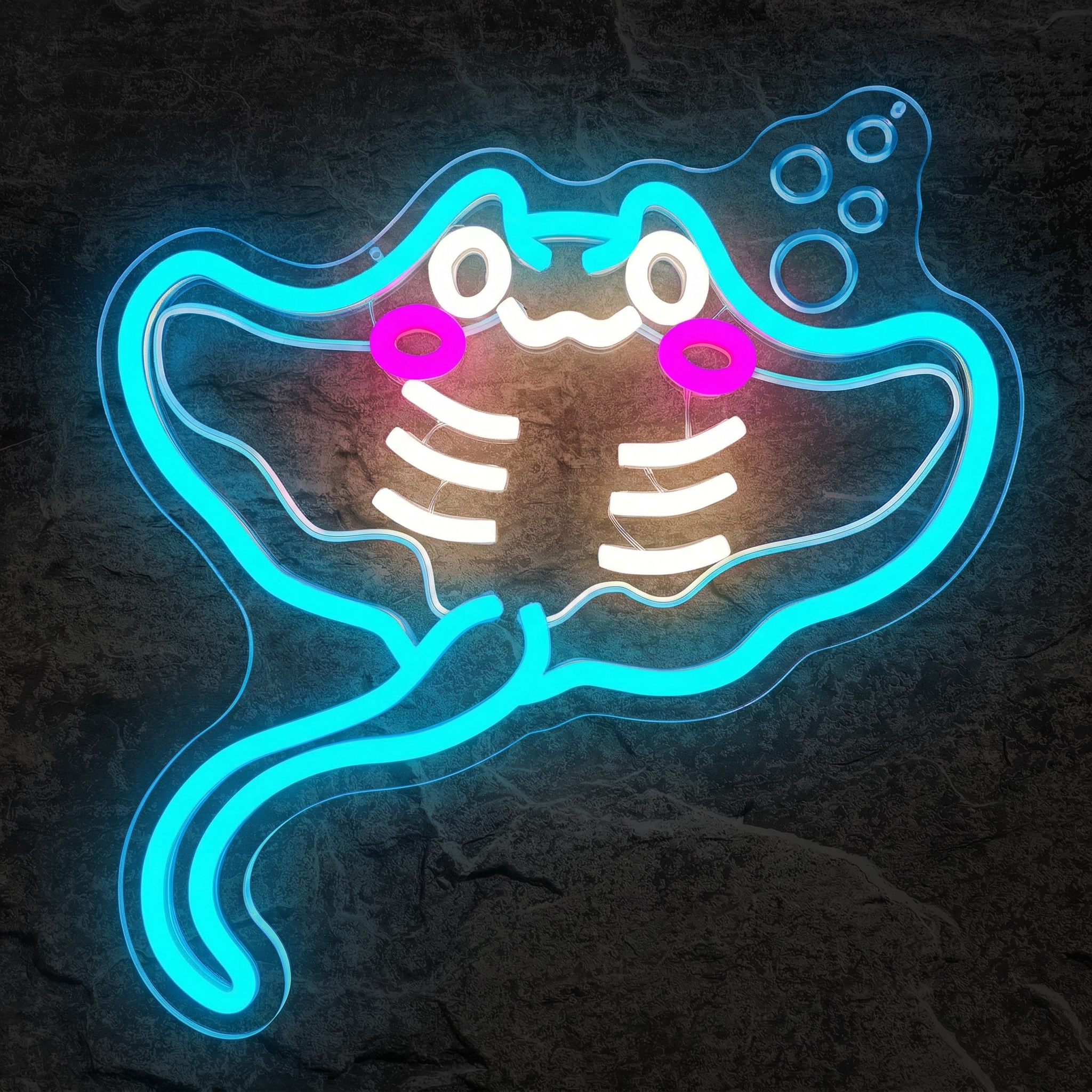 Fabriqué avec des tubes LED flexibles de haute qualité montés sur un fond acrylique transparent découpé au laser, le Néon Raie Manta NeonStar diffuse une lumière bleu cyan douce, enveloppante et profondément esthétique. Contrairement aux anciennes enseignes à gaz, notre néon LED ne chauffe pas, ne grésille pas et ne vibre pas. Il est silencieux comme les fonds marins qu'il représente, et consomme très peu d'énergie. Un choix décoratif beau et responsable.
