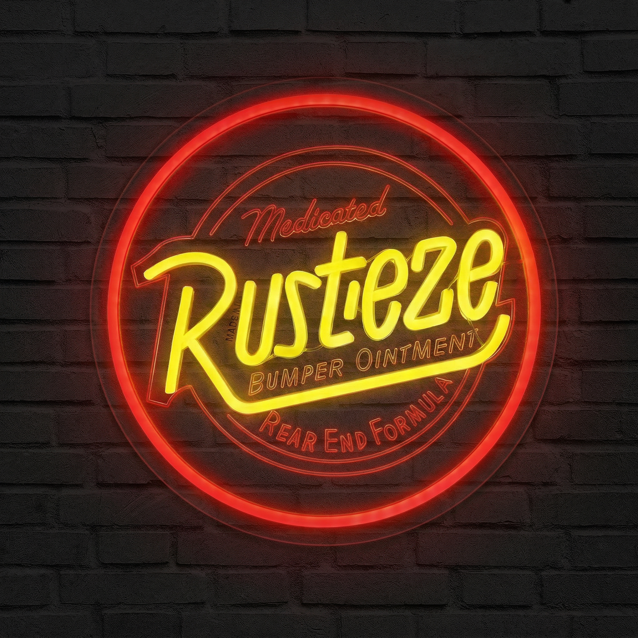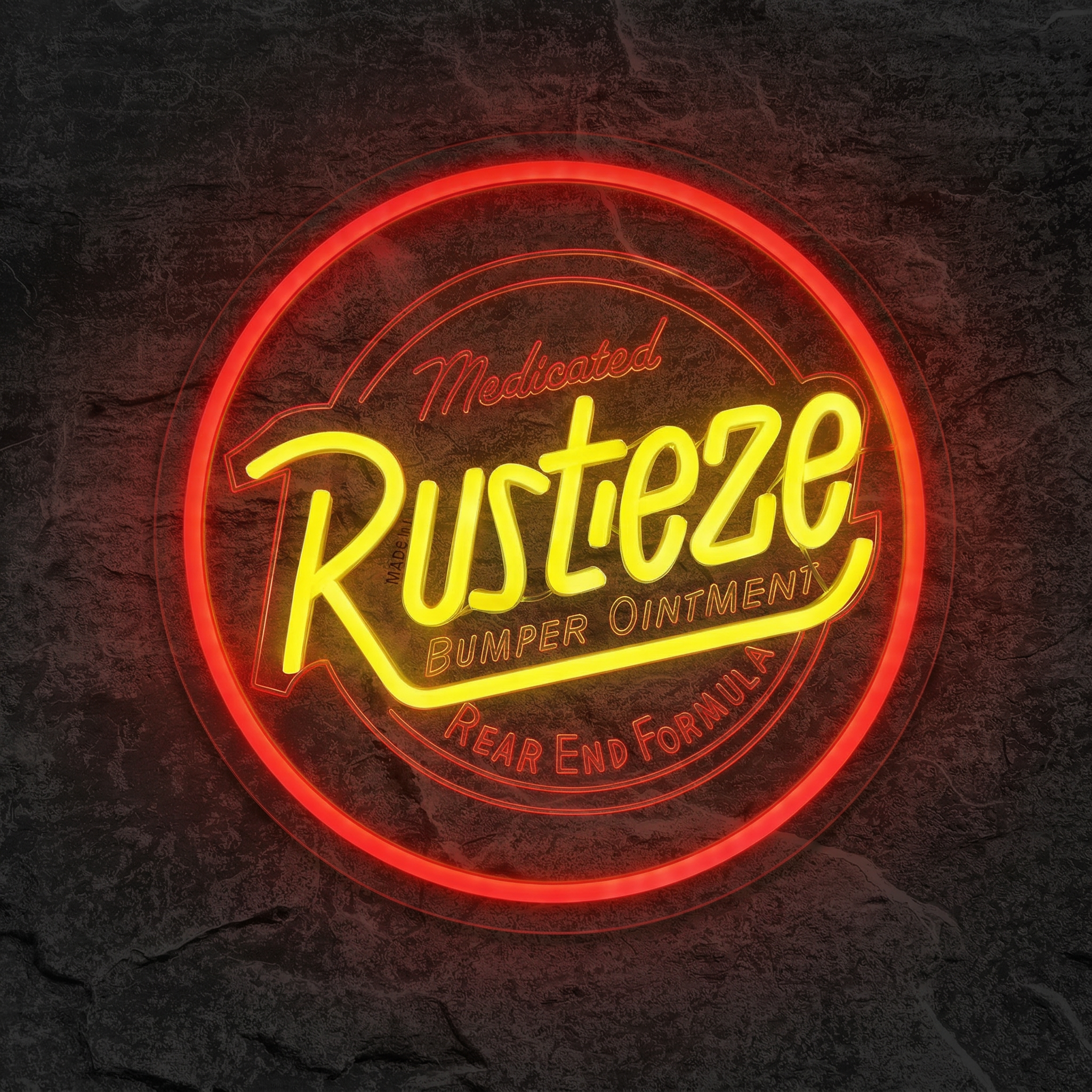 Le design circulaire de ce néon reprend avec précision l'identité visuelle emblématique de la marque fictive Rust-Eze : un rouge vif qui capte l'œil, des lettres cursives jaunes lumineuses qui rappellent les enseignes de garage américaines des années 50, et le slogan complet "Medicated Bumper Ointment" pour les vrais connaisseurs. Chaque courbe, chaque lettre a été pensée pour rester fidèle à l'original tout en gagnant en intensité lumineuse. Le résultat est spectaculaire, de jour comme de nuit.