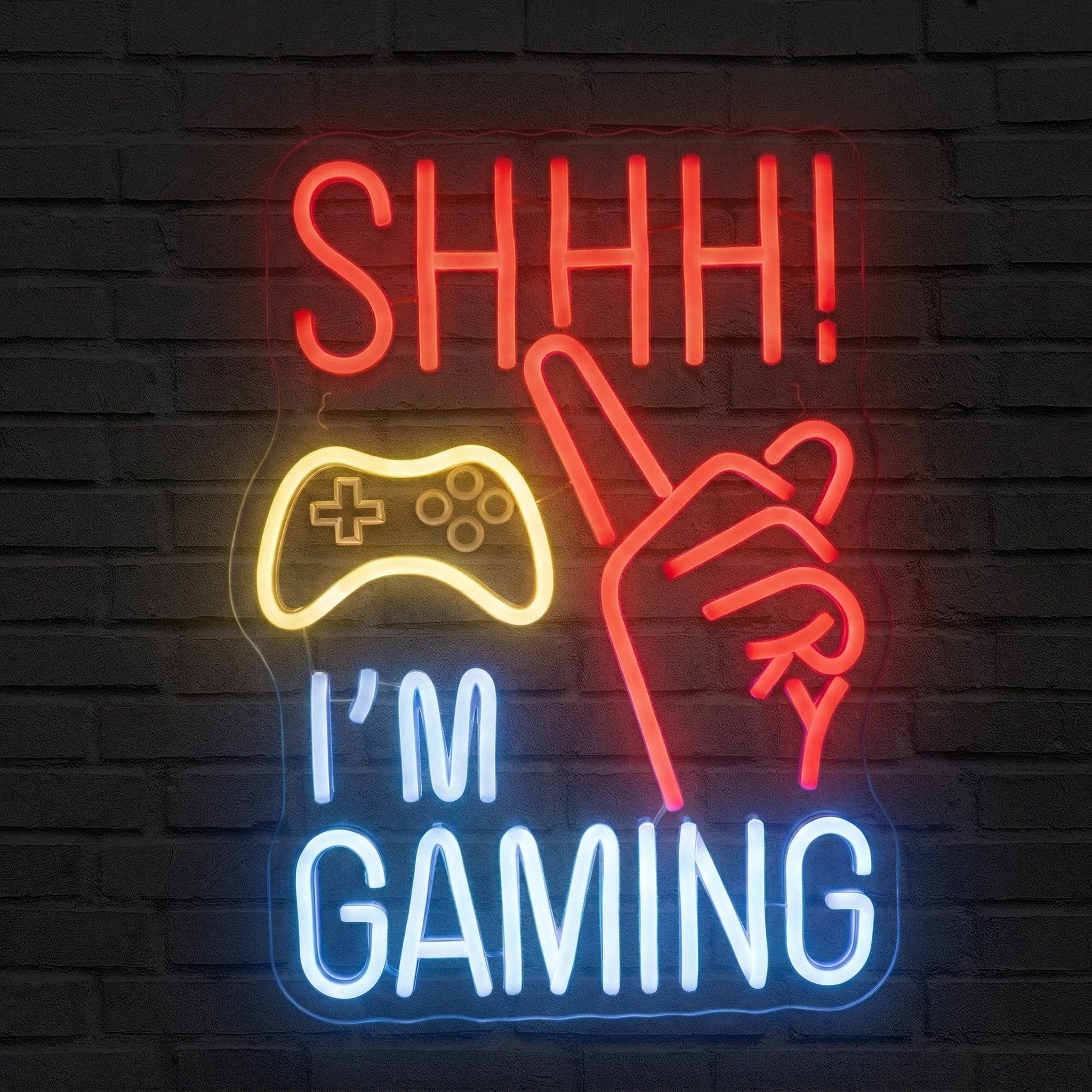 Quand la session commence, le monde s'arrête. Notre Néon Shhh I'm Gaming est bien plus qu'une simple décoration murale — c'est un avertissement lumineux, un message clair envoyé à toute la maisonnée : ne pas déranger. Avec ses teintes rouge et bleu vives pour le texte, sa main stylisée au silence et sa manette jaune iconique, ce néon capture en une seule pièce tout l'esprit du gaming passionné. Accroché au-dessus de votre setup, il transforme instantanément n'importe quelle pièce en véritable QG de gamer.