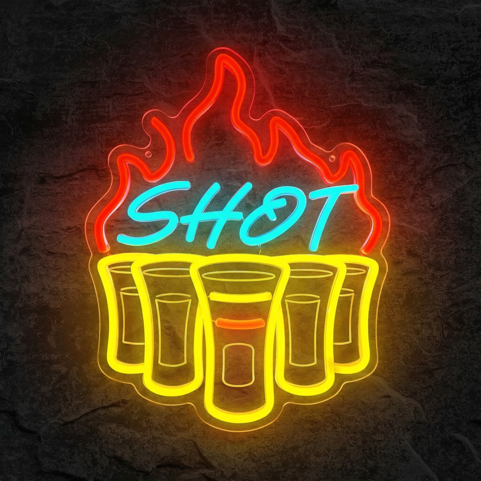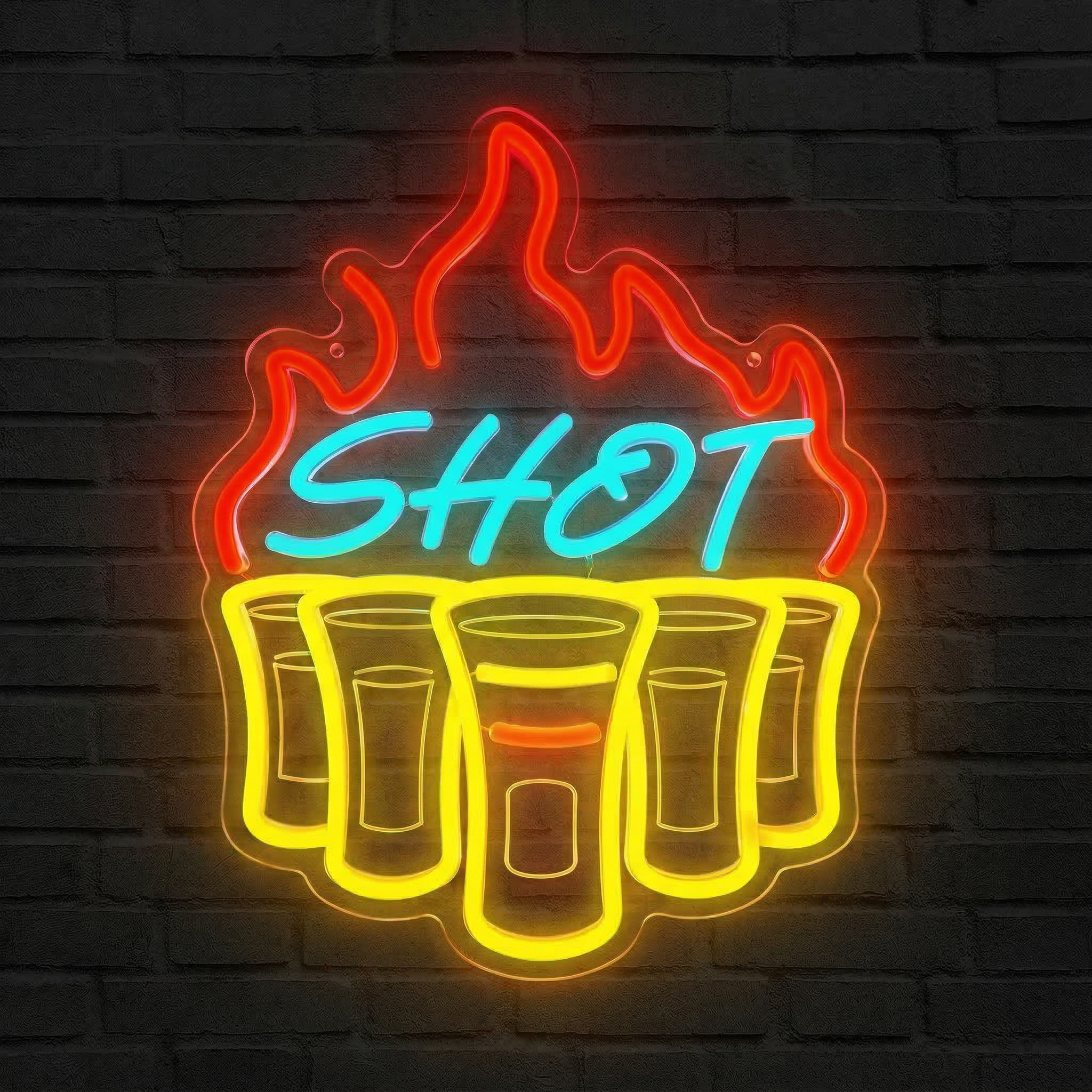 Certaines nuits méritent une scène à la hauteur. Le Néon Shot NeonStar est conçu pour ceux qui veulent transformer leur intérieur en véritable QG de soirée, avec l'ambiance chaleureuse et festive d'un bar branché. Quatre verres à shot dorés, une flamme rouge éclatante et le mot « SHOT » inscrit en turquoise vif : ce néon ne passe pas inaperçu. Il impose sa présence, il annonce la couleur — et il met tout de suite dans l'ambiance.