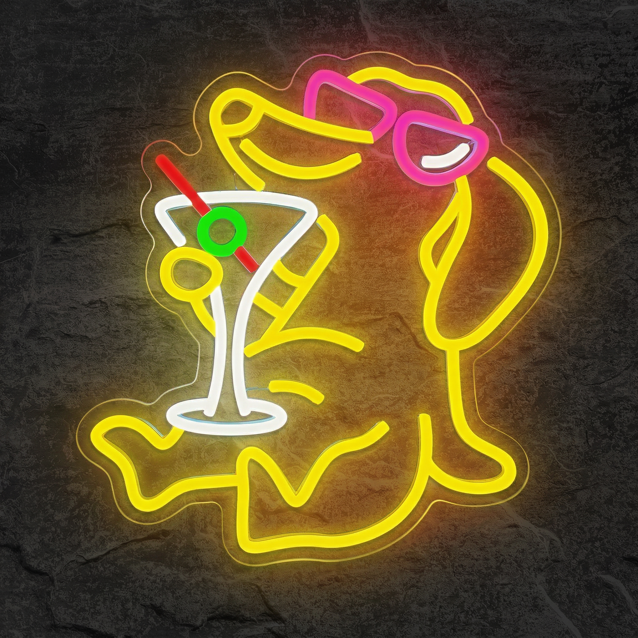 Certains néons décorent un mur. Celui-ci raconte une histoire. Le Néon Teckel Cocktail met en scène le chien le plus stylé de la déco LED : un teckel à lunettes roses, tenant avec élégance un verre triangulaire orné d'olives et de cerises. Une scène qui fait sourire dès le premier regard, et qui transforme instantanément n'importe quel espace en lieu de vie chaleureux, festif et franchement unique. Chez NeonStar, on a voulu capturer cet esprit apéro-chic dans un objet lumineux que l'on ne voit nulle part ailleurs.