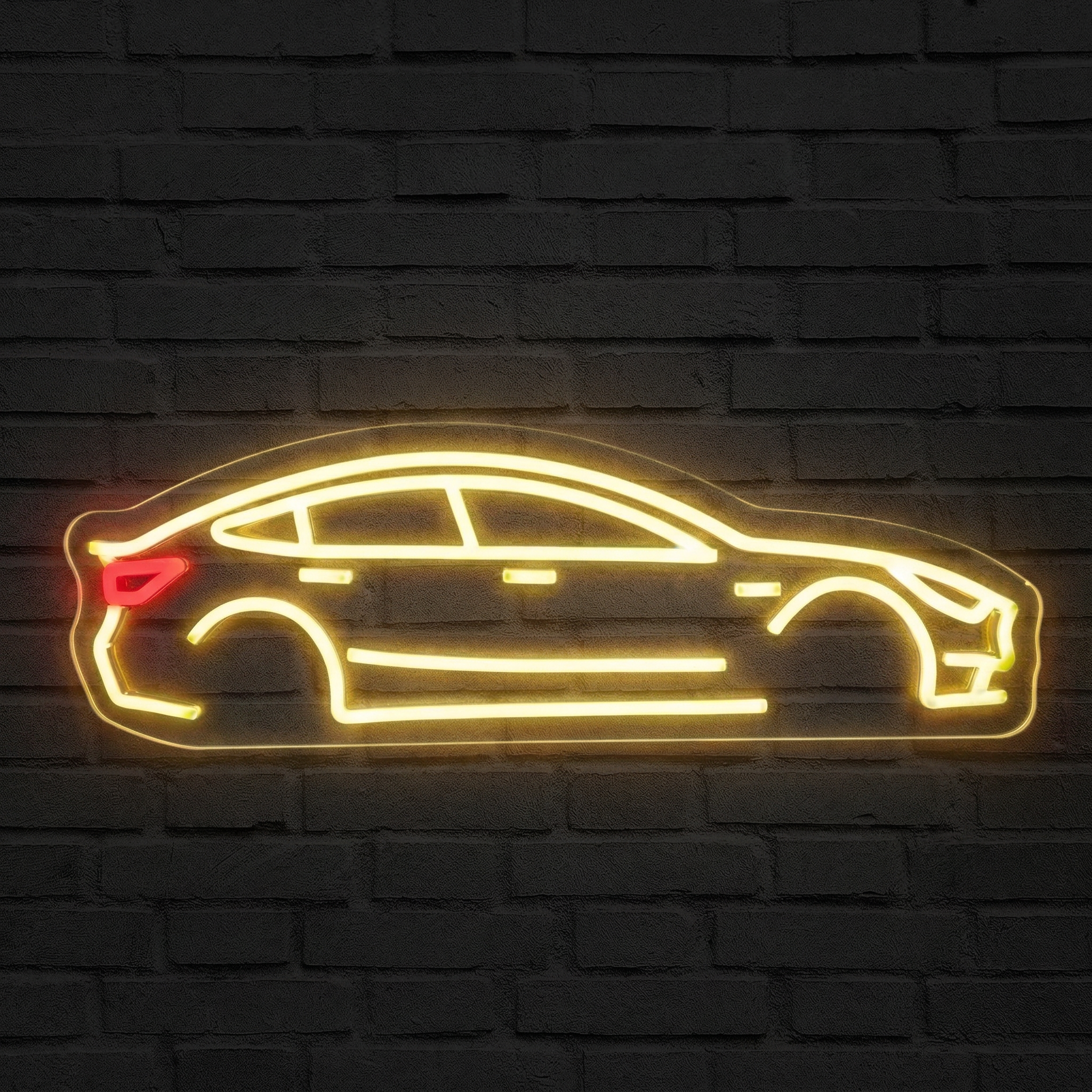 Chez NeonStar, nous avons travaillé chaque détail de ce néon pour capturer l'essence même du design de la Model 3 : ses lignes épurées, sa silhouette basse et profilée, et ses fameux feux arrière traversants qui ont fait sa signature visuelle. Le résultat est un néon d'une précision remarquable, disponible en jaune électrique ou en rouge intense, avec les phares arrière illuminés en rouge pour un rendu encore plus fidèle à l'original. Un objet qui impressionne autant allumé qu'éteint.