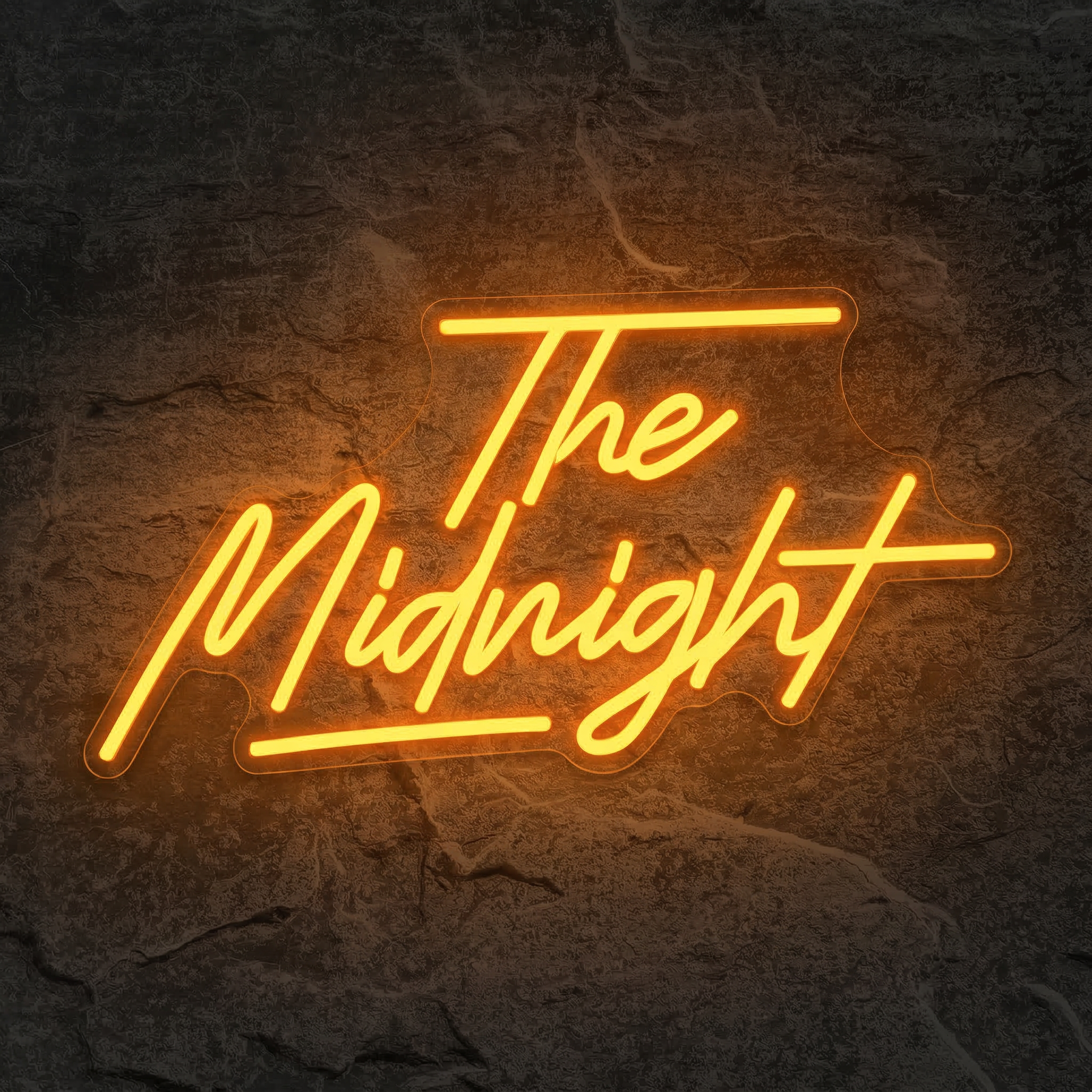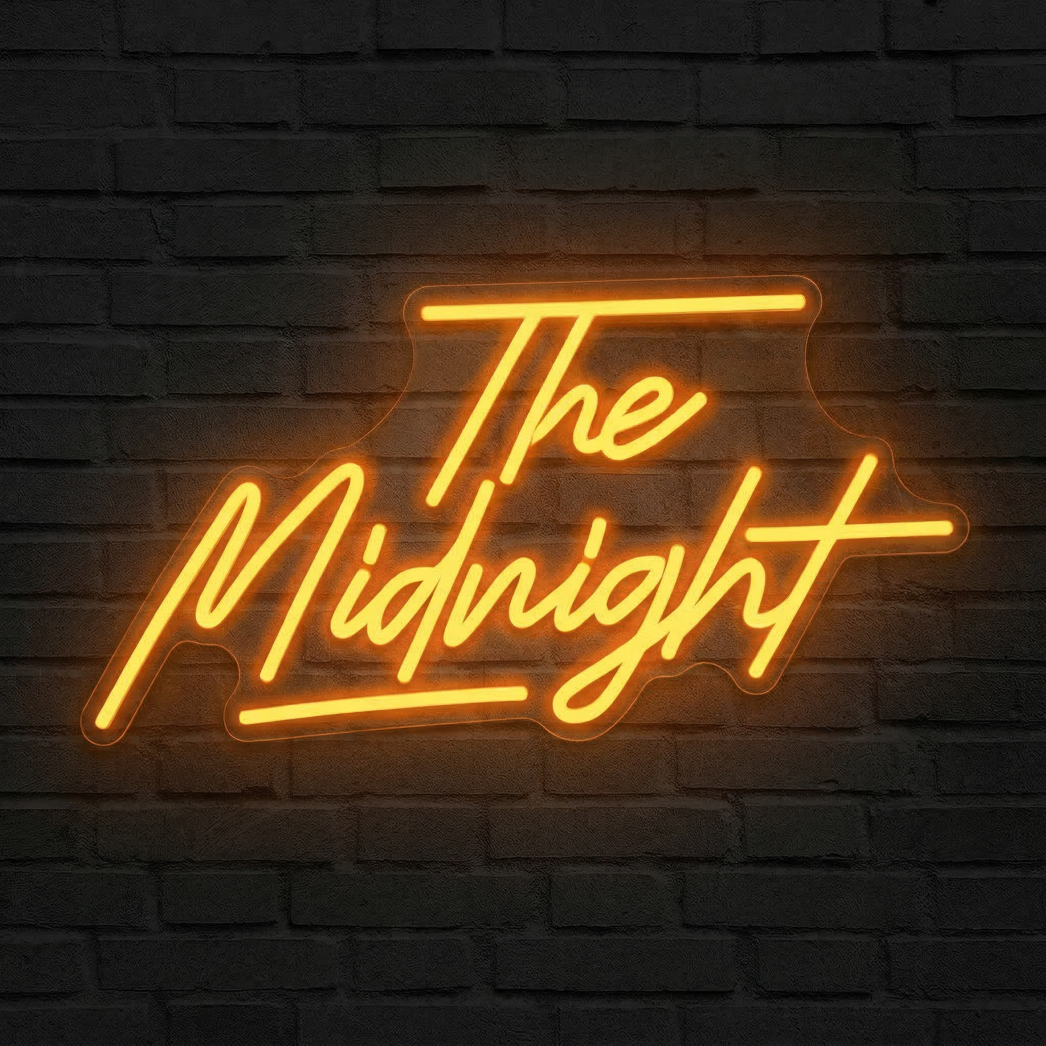 Plongez dans l'univers synthwave de The Midnight avec ce néon LED jaune-orangé aux courbes cursives envoûtantes. L'hommage lumineux parfait pour les fans du groupe.