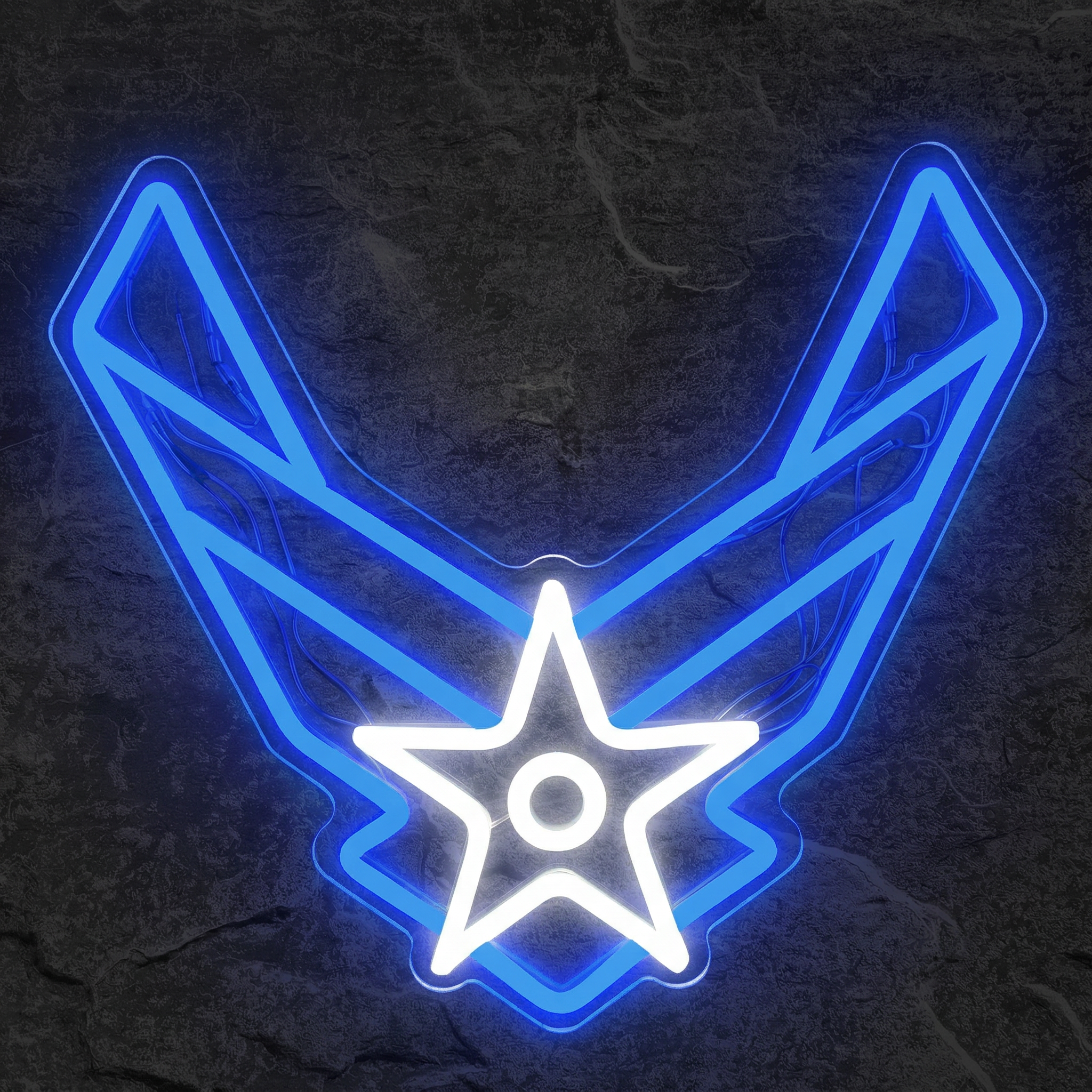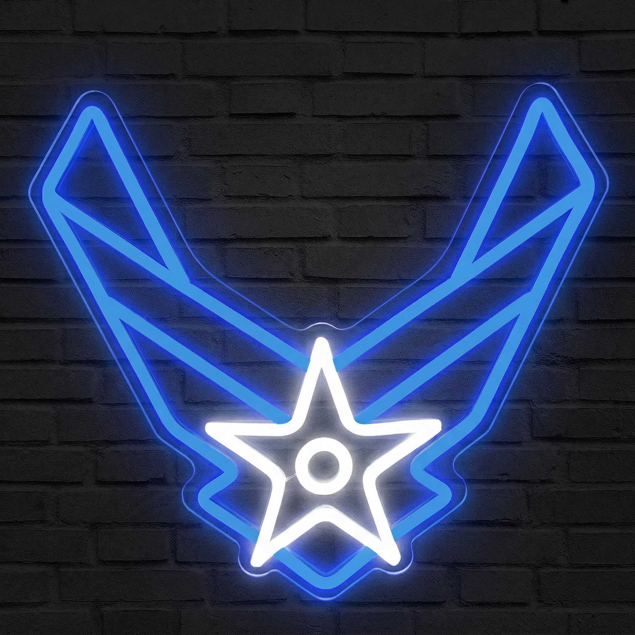 Que vous soyez vétéran, pilote amateur, fan d'aviation ou simplement admirateur de l'esthétique militaire américaine, ce néon parle instantanément à ceux qui comprennent. Accroché dans un bureau, une salle de jeu, un garage, un bar ou un espace de collection, il impose une présence visuelle immédiate. Les ailes stylisées en V et l'étoile centrale sont reproduites avec une fidélité remarquable, capturant l'essence même de l'insigne original dans une lumière vive et chaleureuse.