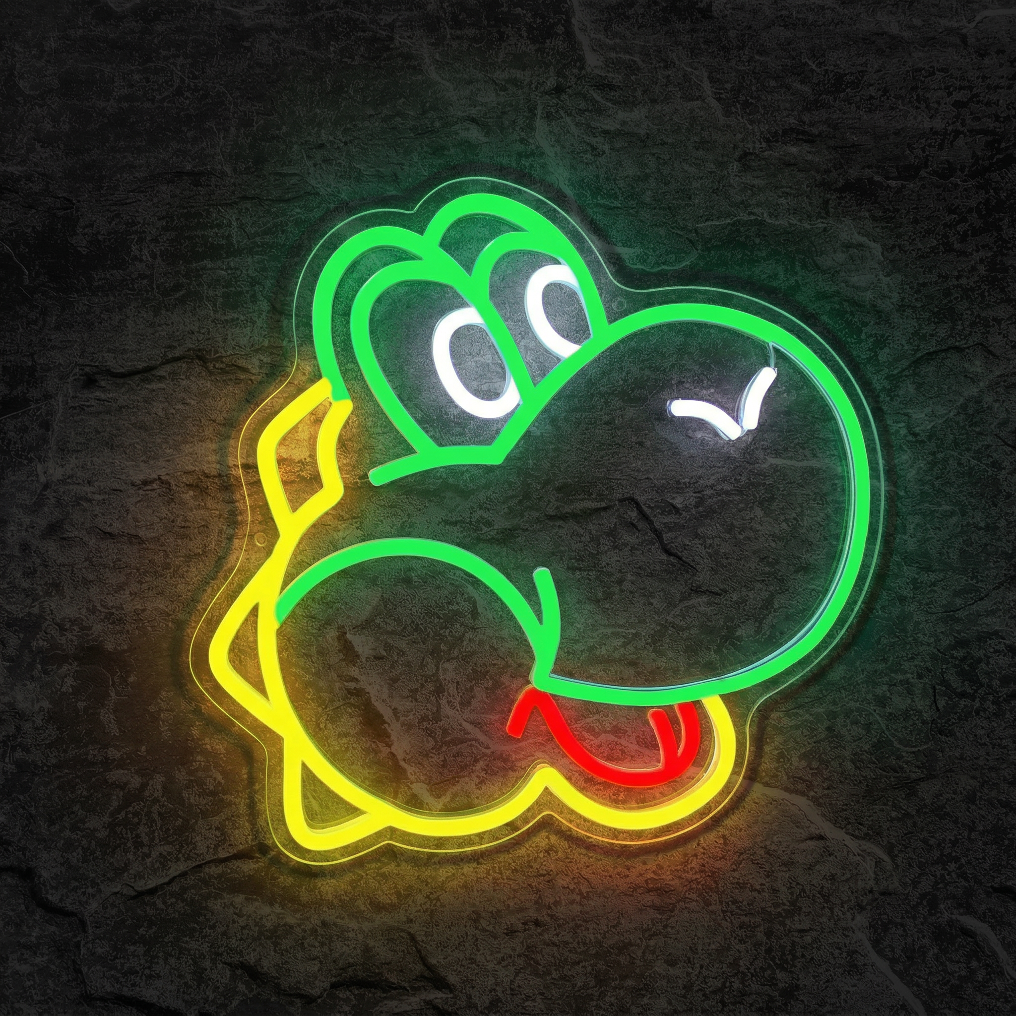 Le design reproduit avec précision les contours caractéristiques de Yoshi grâce à un jeu de couleurs soigneusement choisi : le vert vif de sa silhouette, le blanc de son ventre, le jaune de ses pattes et le rouge de sa selle iconique. Chaque détail a été pensé pour évoquer immédiatement le personnage, même d'un simple coup d'œil. C'est la force d'un bon néon : raconter une histoire en lumière, sans un seul mot.
