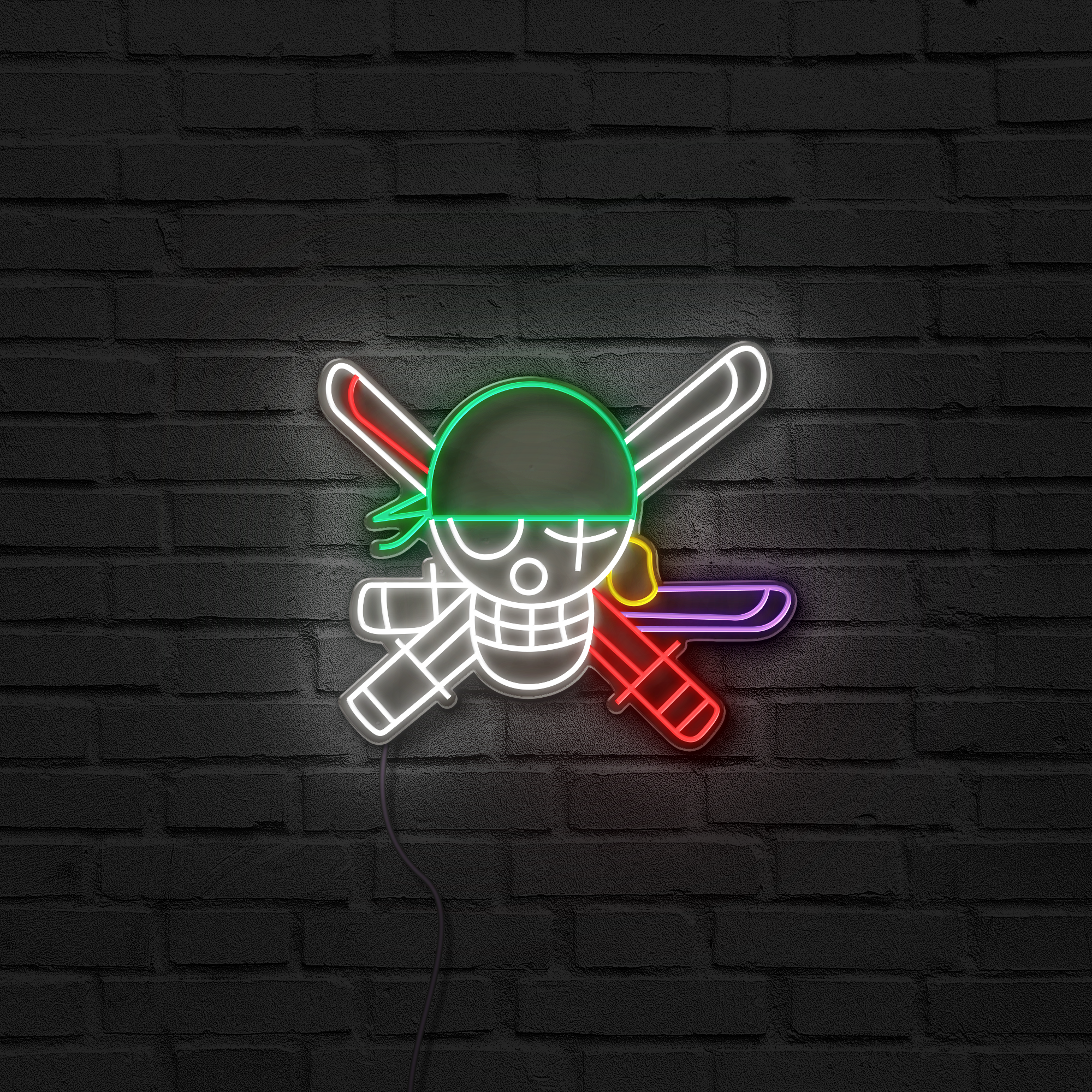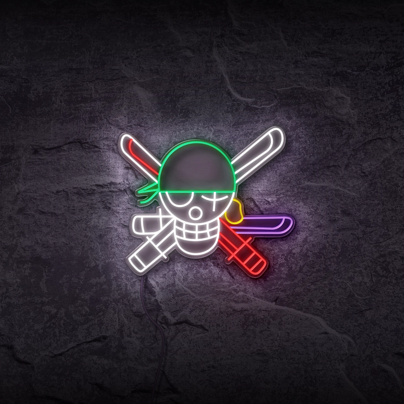 Enseigne néon inspirée de Roronoa Zoro, le sabreur légendaire de One Piece. Parfaite pour une déco manga, audacieuse et épique.
